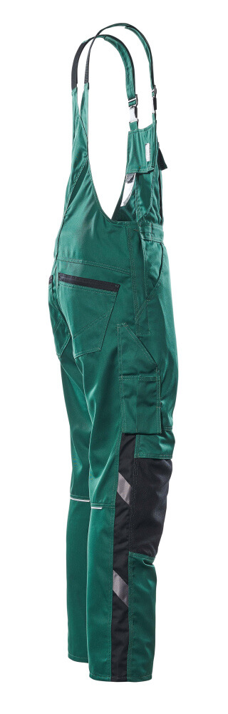 Bicolore. Tissu léger. Coutures triples sur les jambes et dans l'entrejambe. Bretelles ajustables en tissu et court ruban élastique très résistant - boucles en plastique. Poche bavette avec poche stylo, poche téléphone et rabat avec boutons-pression recouverts. Anneau en D. Poche intérieure avec fermeture par bande auto-agrippante. Taille réglable. Jambes ergonomiques. Braguette zippée. Poches latérales. Poches arrière renforcées. Patte-marteau réglable. Poche cuisse avec compartiment téléphone - rabat avec boutons-pression non visibles/recouverts. Poche mètre pliant renforcée. Poche stylo. Poches genouillères réglables en CORDURA® particulièrement solides (1000 D) sous rabat avec insertion des genouillères par le haut. Effets rétroréfléchissants. Double certification compatible avec le modèle de genouillères large selon la norme EN 14404-3.