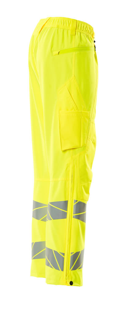 Tissu fluorescent avec bandes rétroréfléchissantes. Un tissu très résistant à l'usure, respirant, imperméable et coupe-vent. Coutures thermocollées. Ouverture zippée frontale des deux côtés pour pouvoir sortir les poches flottantes du pantalon en-dessous. Jambes ergonomiques. Passants de ceinture. Anneau en D. Elastique et cordon de serrage à la taille. Poche pour mètre pliant renforcée, avec une petite poche superposée. Poches genouillères reglables en polyester. Réglage facile de la hauteur de la poche genouillère. Zip sous rabat coupe-vent sur le côté extérieur des jambes. Bord-côtes à l'intérieur en bas au niveau du pied. Double certification compatible avec le modèle de genouillères large selon la norme EN 14404-3.