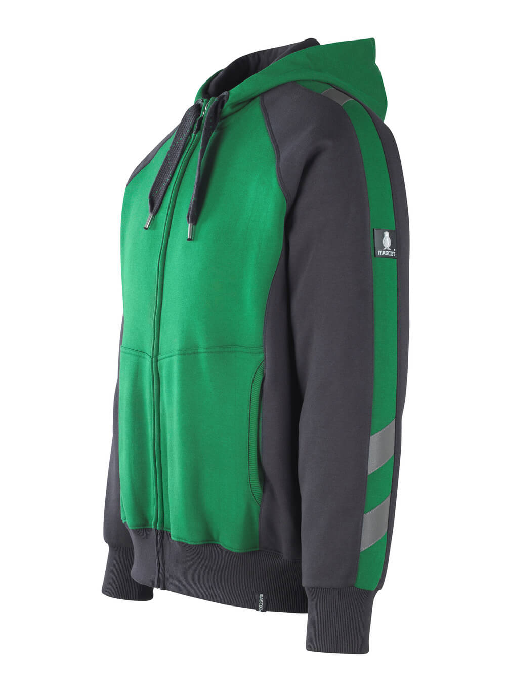 Premium Performance. Bicolore. Qualité robuste. Coton peigné. Molleton gratté à l’intérieur. Coupe moderne. Capuche doublée avec cordon de serrage. Zip intégral. Poches latérales. Taille et poignets en maille côtelée. Bande de renfort sur les coutures au niveau de la nuque.
