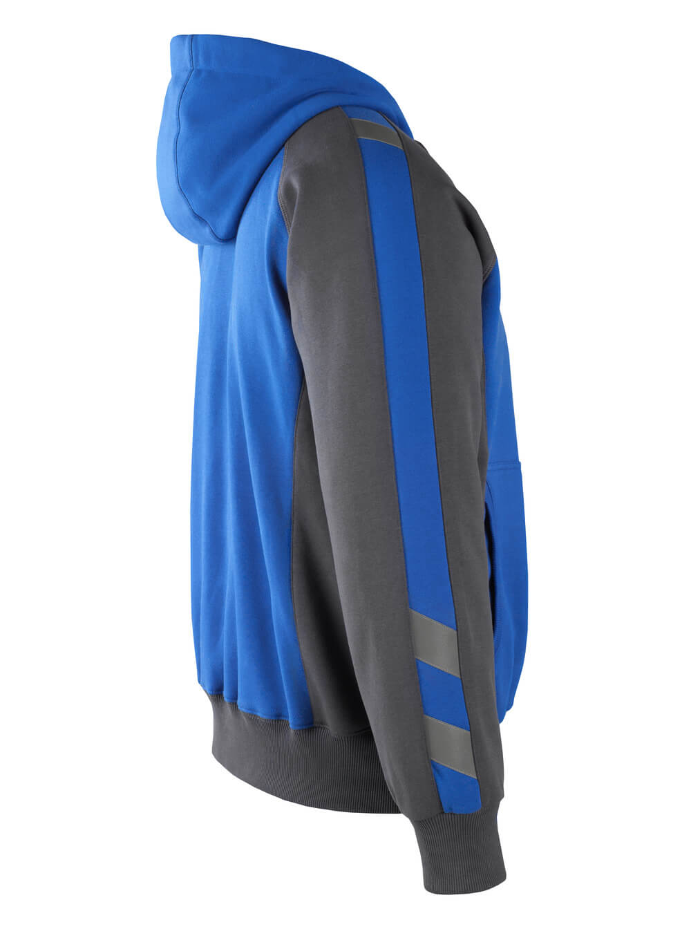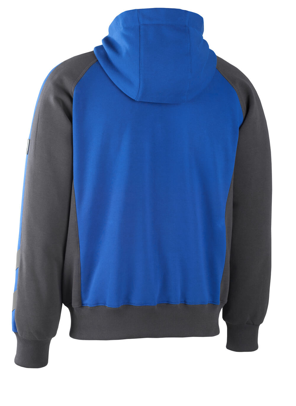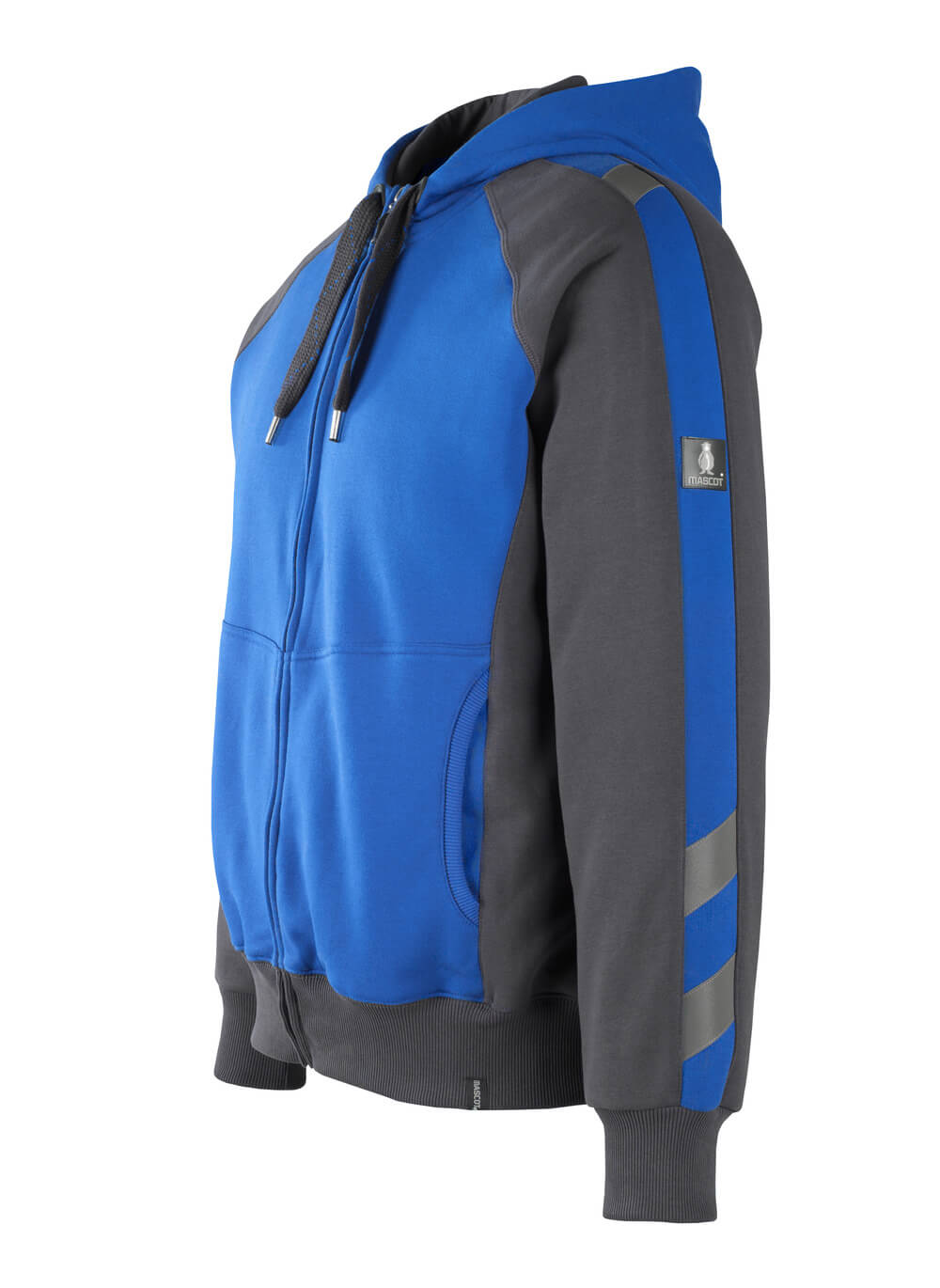 Premium Performance. Bicolore. Qualité robuste. Coton peigné. Molleton gratté à l’intérieur. Coupe moderne. Capuche doublée avec cordon de serrage. Zip intégral. Poches latérales. Taille et poignets en maille côtelée. Bande de renfort sur les coutures au niveau de la nuque.