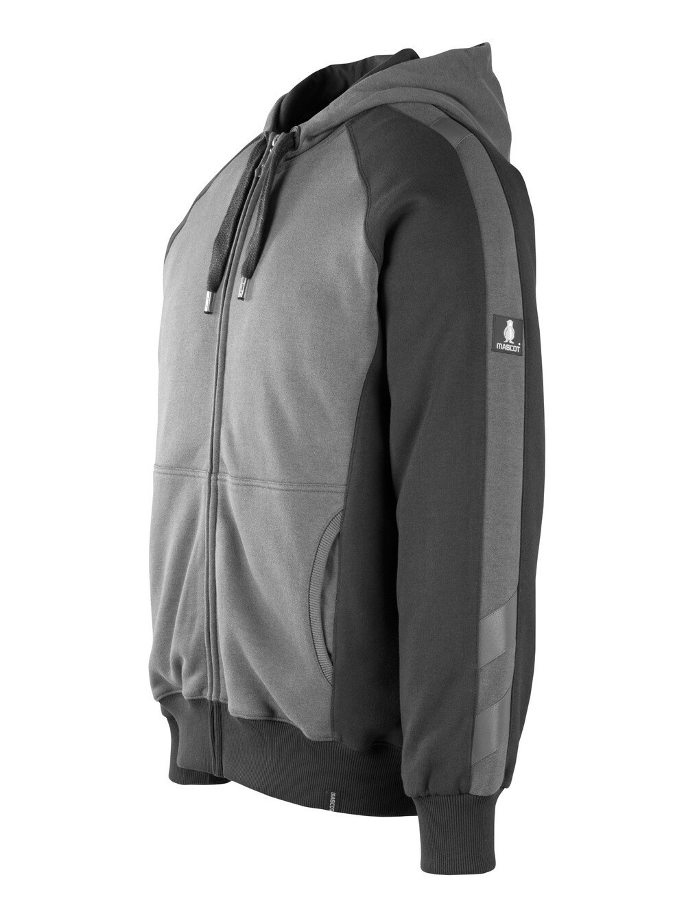 Premium Performance. Bicolore. Qualité robuste. Coton peigné. Molleton gratté à l’intérieur. Coupe moderne. Capuche doublée avec cordon de serrage. Zip intégral. Poches latérales. Taille et poignets en maille côtelée. Bande de renfort sur les coutures au niveau de la nuque.