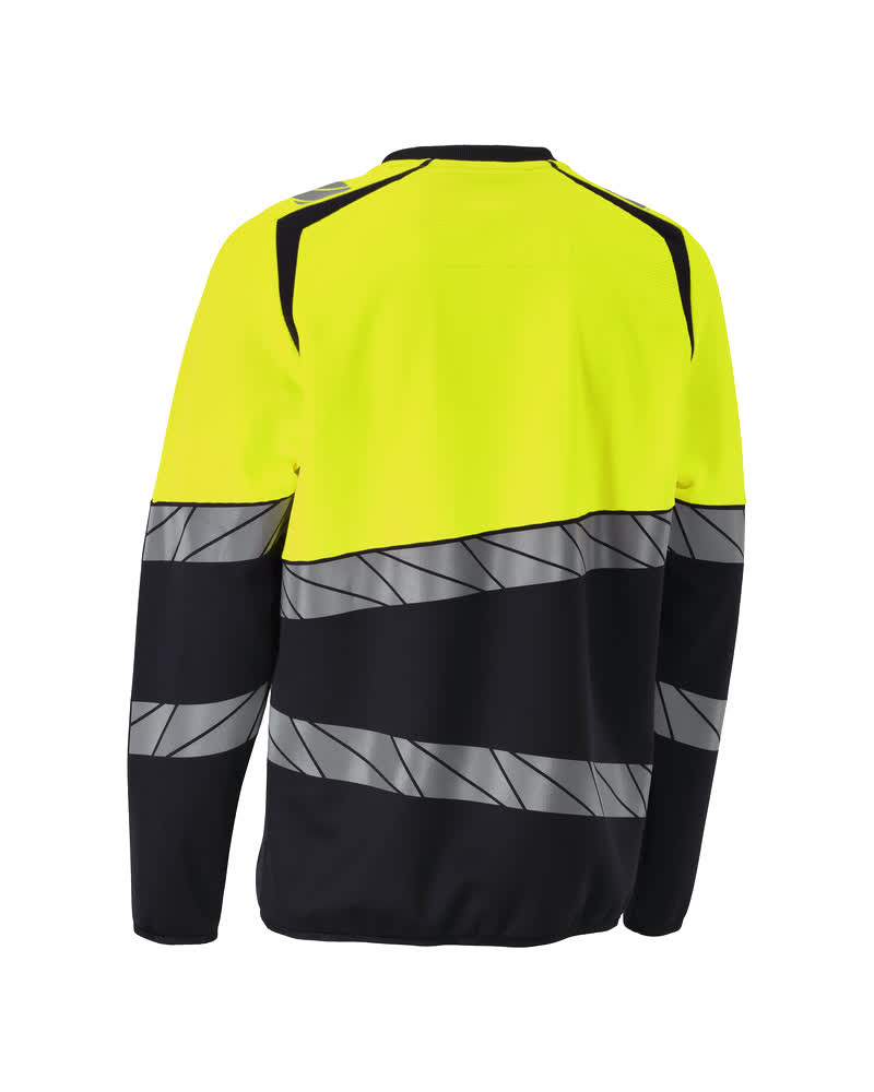 Premium. Fluorescent(e) avec bandes rétroréfléchissantes transversales en biais. Bicolore. Coupe moderne. Intérieur confortable en coton et polyester stretch résistant à l'extérieur. Motif jacquard carré. Bandes rétroréfléchissantes stretch. Encolure ronde. Encolure en maille côtelée. Pièce de renfort au niveau de la nuque. Bande de renfort sur les coutures au niveau de la nuque. Bande élastique au niveau des poignets et du bord inférieur.