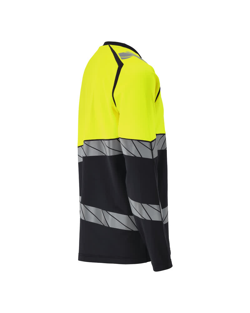 Premium. Fluorescent(e) avec bandes rétroréfléchissantes transversales en biais. Bicolore. Coupe moderne. Intérieur confortable en coton et polyester stretch résistant à l'extérieur. Motif jacquard carré. Bandes rétroréfléchissantes stretch. Encolure ronde. Encolure en maille côtelée. Bande de renfort sur les coutures au niveau de la nuque.