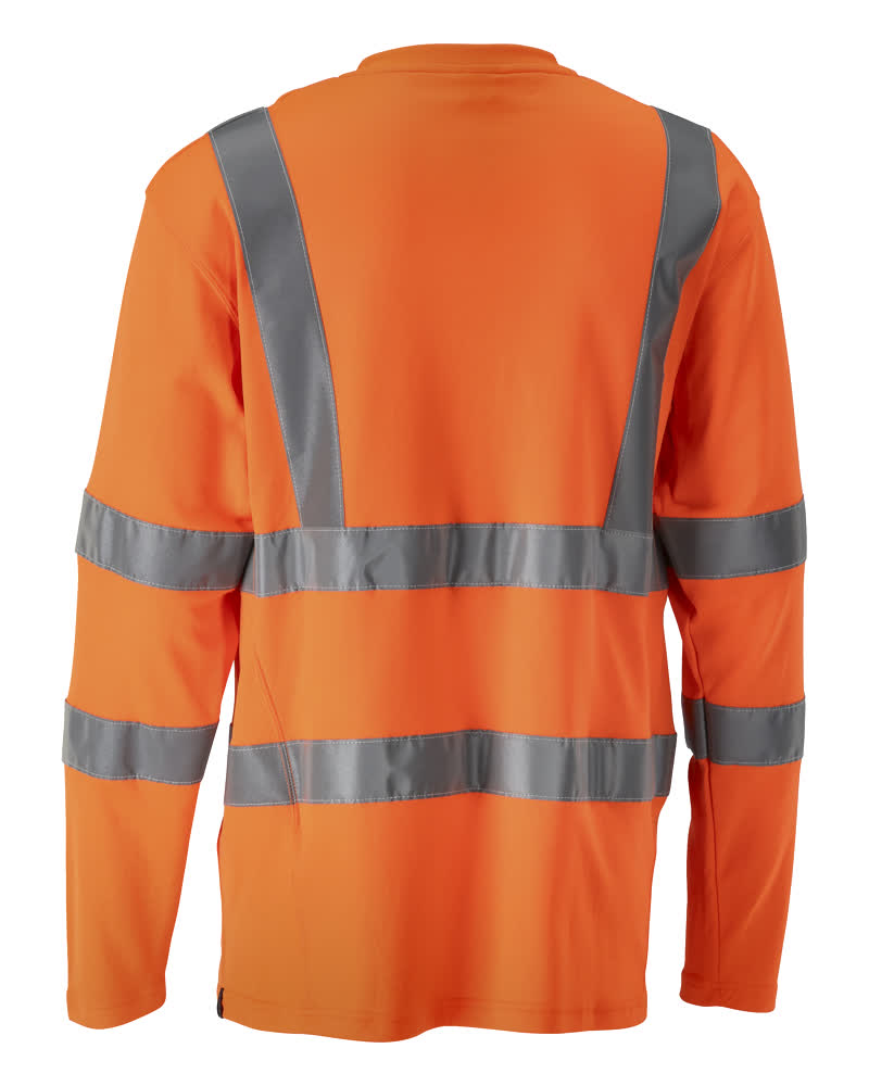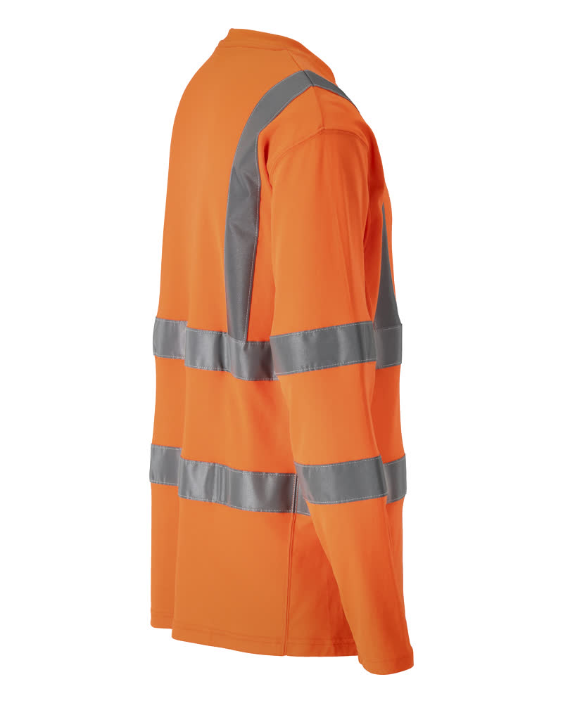 Premium. Tissu fluorescent avec bandes rétroréfléchissantes horizontales et verticales. Unicolore. Coupe moderne. Intérieur confortable en coton et extérieur en polyester résistant. Bandes rétroréfléchissantes stretch. Encolure en V. Encolure en maille côtelée. Bande de renfort sur les coutures au niveau de la nuque. Filet de ventilation sous les bras.