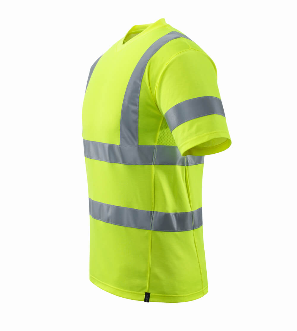 Premium. Tissu fluorescent avec bandes rétroréfléchissantes horizontales et verticales. Unicolore. Coupe moderne. Intérieur confortable en coton et extérieur en polyester résistant. Bandes rétroréfléchissantes stretch. Encolure en V. Encolure en maille côtelée. Bande de renfort sur les coutures au niveau de la nuque. Filet de ventilation sous les bras.