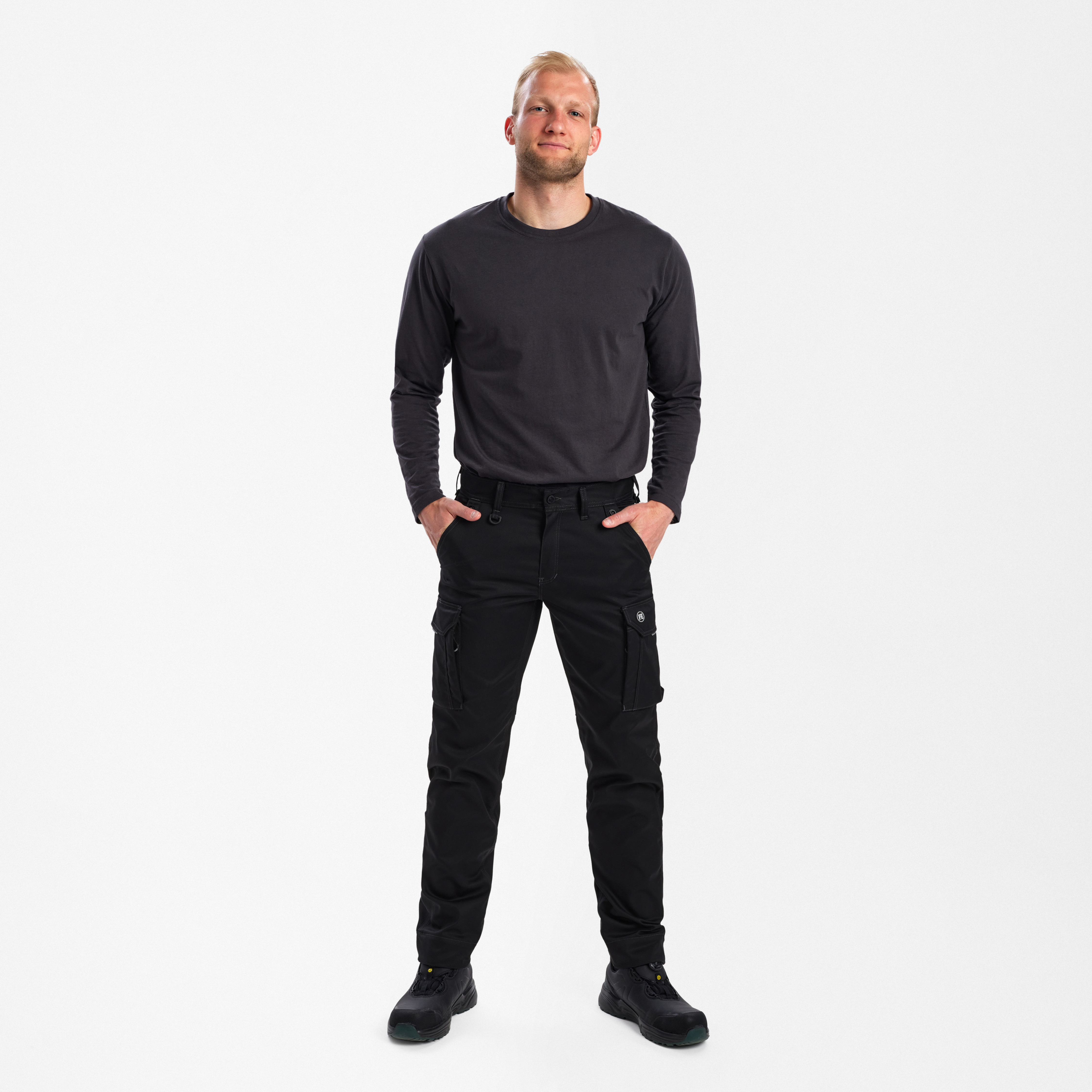 Pantalon de service fonctionnel, extensible, coupe étroite, avec de nombreux détails pratiques. Préformage ergonomique au genou et pièce dans la couture intérieure pour le confort de l’entrejambe. Le tissu extensible procure un meilleur confort ; avec l’apport de matériaux particulièrement extensibles et bien aérés sur l’arrière du genou et dans l’empiècement de la couture intérieure, le confort est particulièrement élevé. Anneau en D sur le devant, par exemple pour fixer un badge. Deux grandes poches en biais sur le devant. Deux poches revolver. Deux poches cuisse à rabat. Les poches cuisse comportent une poche zippée supplémentaire. La poche cuisse droite comporte une poche mètre invisible. Bandes réfléchissantes sur l’arrière de la jambe pour une meilleure visibilité. Le pantalon a un revers particulièrement large prévu pour ajuster la longueur des jambes si nécessaire. Défaire une seule couture pour allonger la longueur des jambes, et il y a toujours une couture.
