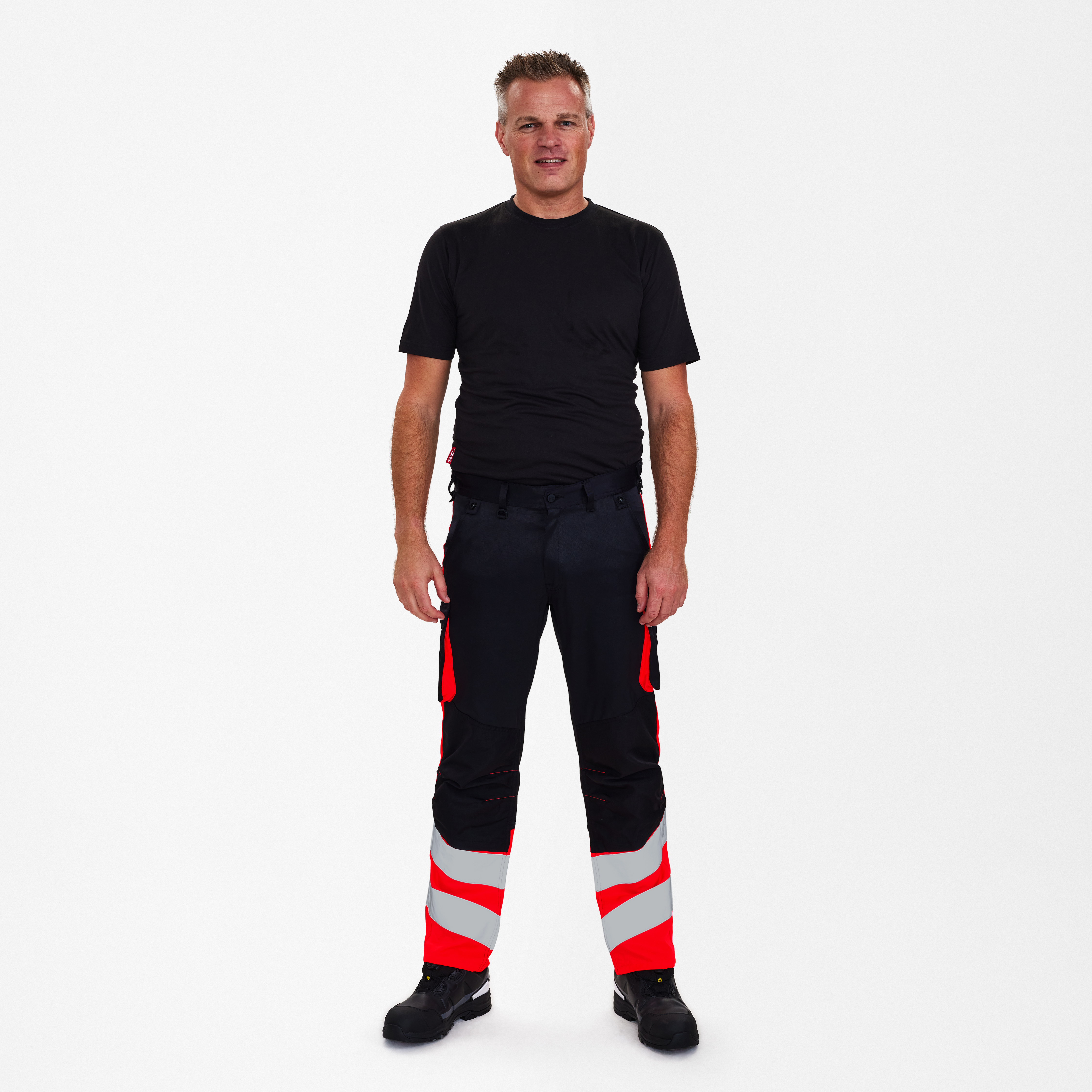 Pantalon fluorescent fonctionnel et, à coupe moderne. Ajustement optimal avec entre autres genouillère de forme ergonomique. Le tissu est résistant et respirant. Il est fabriqué en 50% polyester régénéré. L’élastique à la taille assure un bon ajustement et permet au pantalon de rester bien en place pendant les mouvements. Anneau en D avant pour le rangement de la carte d’identité, par exemple. Deux grandes poches obliques sur le devant. Deux poches arrière à rabat et fermées par bande velcro. Deux poches cuisse que l’on peut fermer avec une bande velcro sur le côté gauche, la poche cuisse a une poche supplémentaire pour téléphone ainsi qu’une poche intérieure par exemple pour le talkie-walkie. Sur le côté droit, il y a une poche intérieure pour ranger par exemple le mètre pliant. Renfort aux genoux / Poche pour les genoux avec fermeture velcro au bas. Le renfort aux genoux est fabriqué en CORDURA®. Bandes réfléchissantes sur le bas de la jambe. Classe de vêtement 1. Testé après 50 lavages.