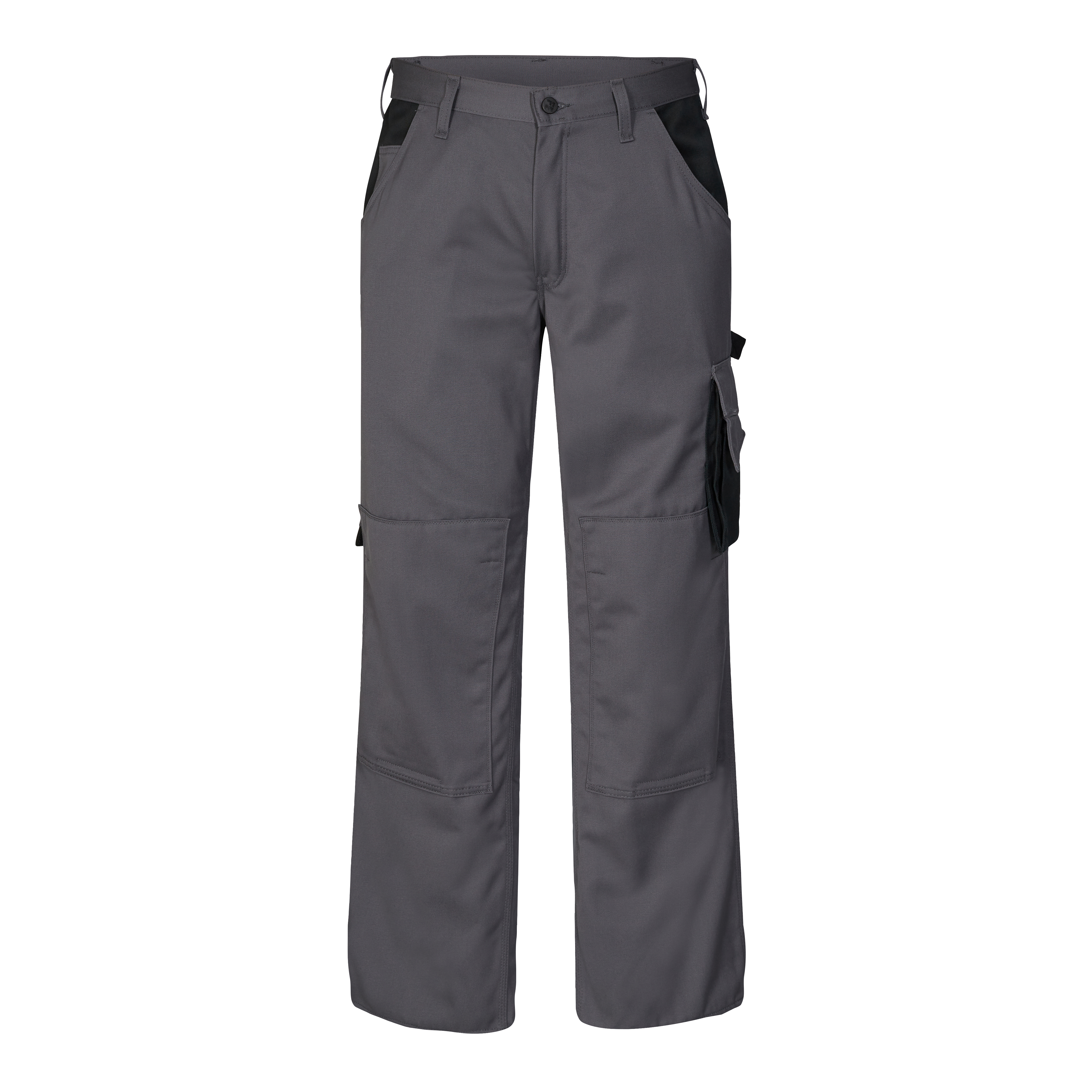 Bicolore. Design élégant. Deux poches latérales, une avec poche de monnaie. Deux poches revolver. Poche cuisse logeable avec poche pour portable et poches pour crayons. Passant porte-marteau. Grande poche mètre renforcée à soufflet. Renforts genoux et poches genouillères à fermeture velcro réglable au bas, pour protection mousse. Supporte un lavage industriel.