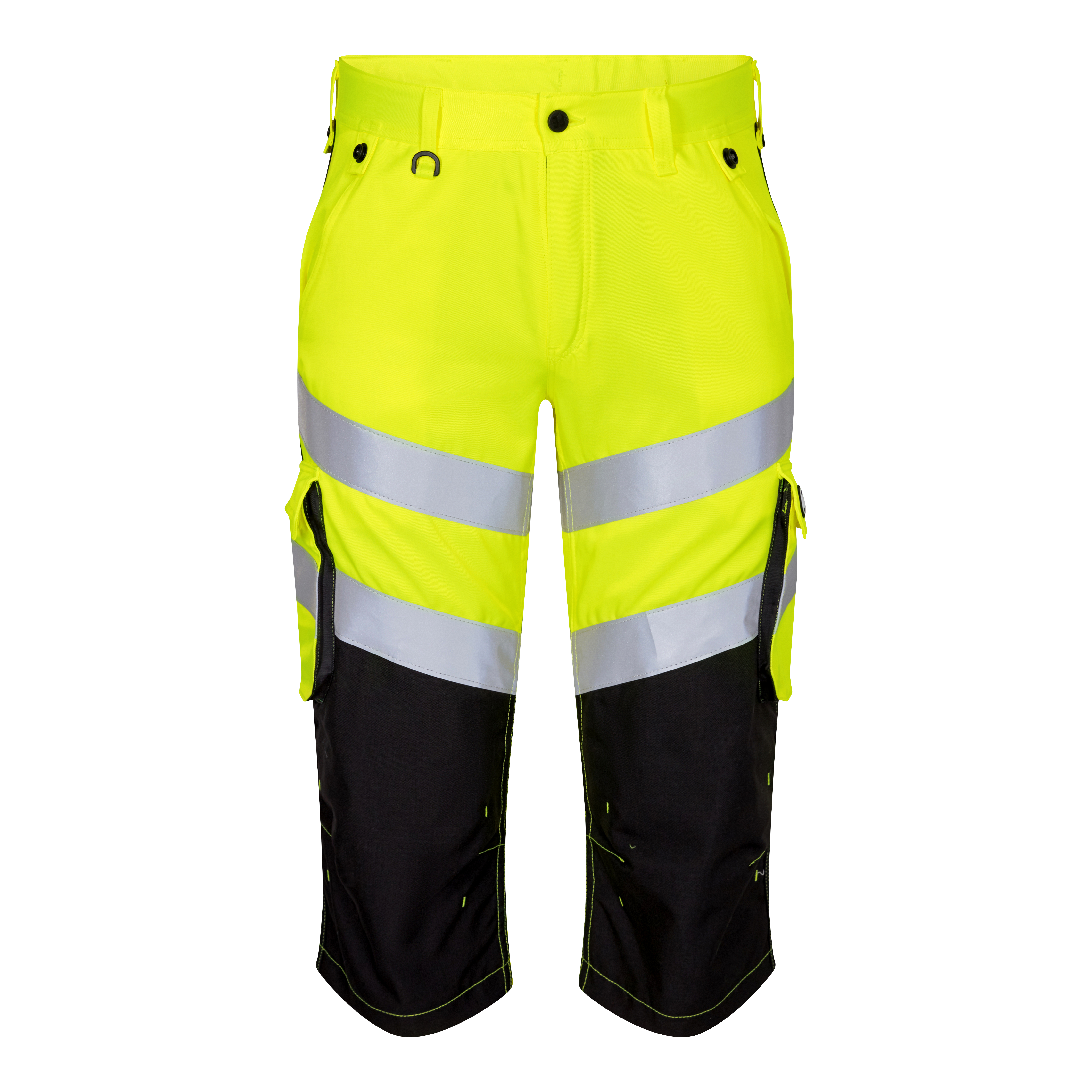 Short fluorescent, extensible et fonctionnel à coupe moderne. Le tissu est résistant et respirant. Il est fabriqué en 50% polyester régénéré. L’élastique à la taille assure un bon ajustement et permet au pantalon de rester bien en place pendant les mouvements. Anneau en D avant pour le rangement de la carte d’identité, par exemple. Deux grandes poches obliques sur le devant. Deux poches arrière à rabat et fermées par bande velcro. Sur le côté gauche, la poche cuisse a une poche supplémentaire pour téléphone ainsi qu’une poche intérieure par exemple pour le talkie-walkie. Sur le côté droit, il y a une poche intérieure pour ranger par exemple le mètre pliant. Renfort aux genoux / Poche pour les genoux avec fermeture velcro au bas. Le renfort aux genoux est fabriqué en CORDURA®. Bandes réfléchissantes sur la cuisse. Classe de vêtement 1. Testé après 50 lavages.