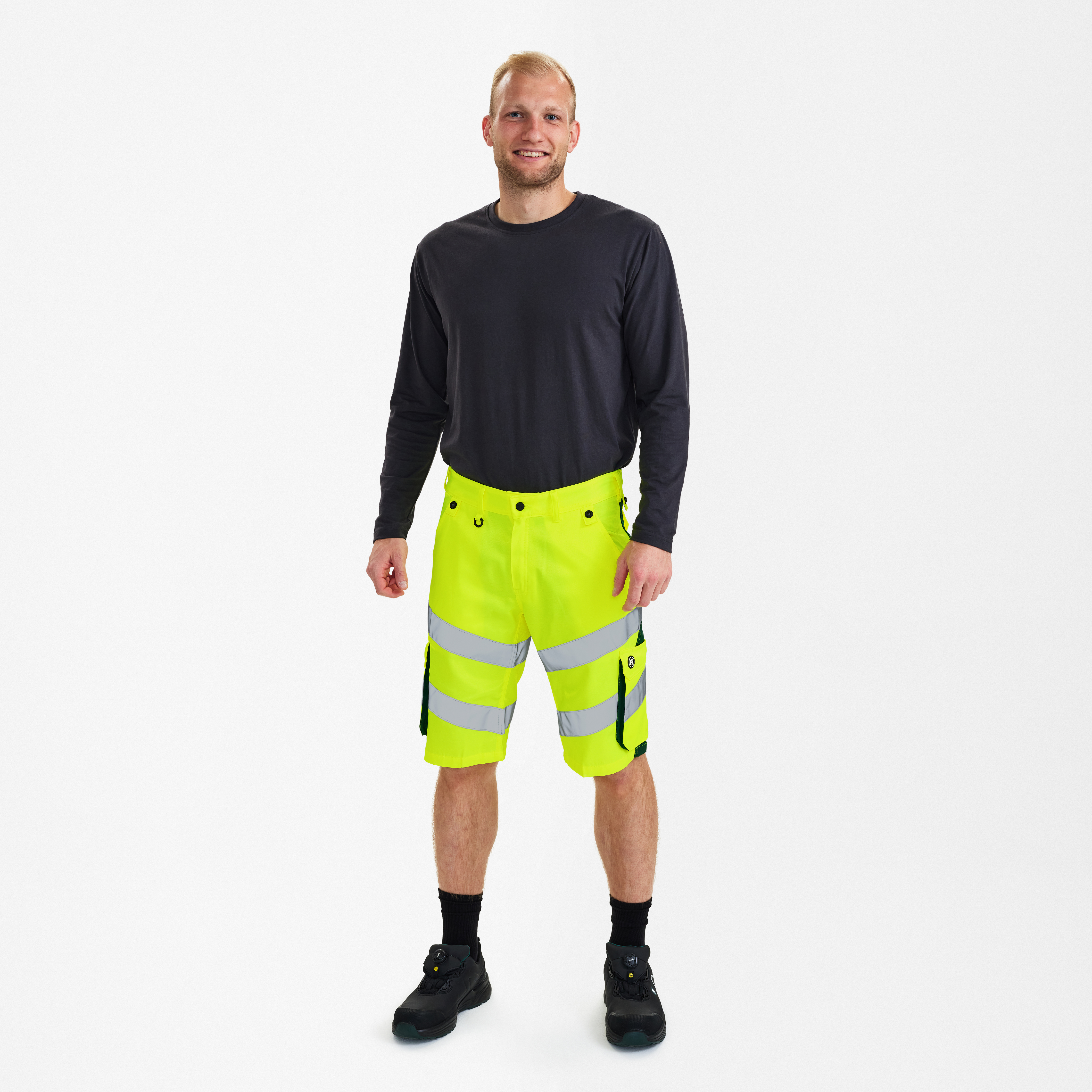 Short fluorescent, extensible et fonctionnel à coupe moderne. Le tissu est résistant et respirant. Il est fabriqué en 50% polyester régénéré. L’élastique à la taille assure un bon ajustement et permet au pantalon de rester bien en place pendant les mouvements. Anneau en D avant pour le rangement de la carte d’identité, par exemple. Deux grandes poches obliques sur le devant. Deux poches arrière à rabat et fermées par bande velcro. Sur le côté gauche, la poche cuisse a une poche supplémentaire pour téléphone ainsi qu’une poche intérieure par exemple pour le talkie-walkie. Sur le côté droit, il y a une poche intérieure pour ranger par exemple le mètre pliant. Bandes réfléchissantes sur la cuisse. Classe de vêtement 1. Testé après 50 lavages.