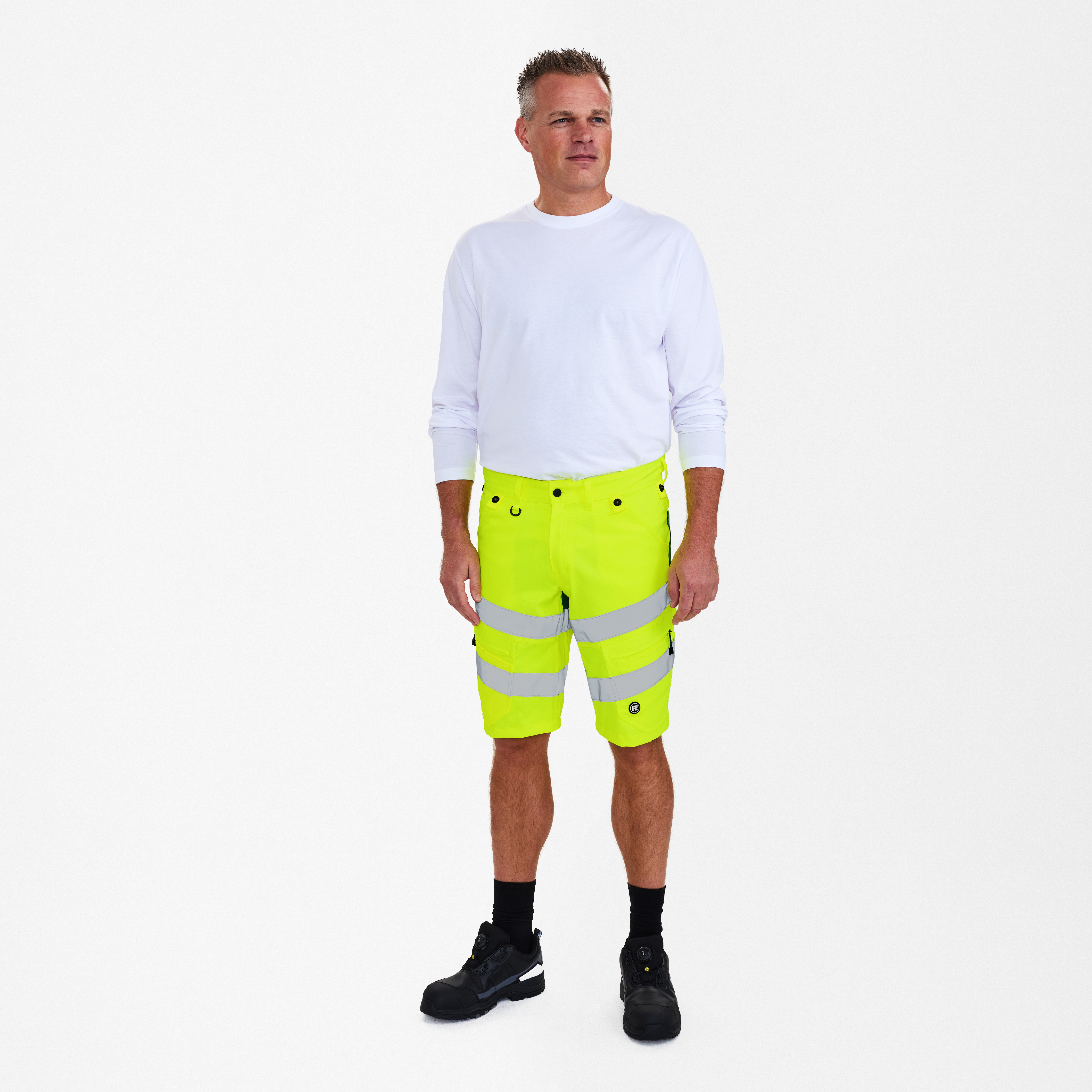 Short extensible, fonctionnel et fluorescent de coupe moderne. Tissu super extensible offrant une grande liberté de mouvements et beaucoup de confort. Anneau en D avant pour le rangement de la carte d’identité, par exemple. Deux grandes poches obliques sur le devant. Deux poches arrière. Deux poches cuisse qu’on peut fermer avec une fermeture à glissière. Sur le côté gauche, la poche cuisse a une poche supplémentaire pour téléphone. Sur le côté droit, la poche cuisse comporte une poche pour mètre pliant avec des compartiments supplémentaires, ainsi qu’une poche pour couteau, toutes deux renforcées. Classe de vêtement 1. Testé après 50 lavages