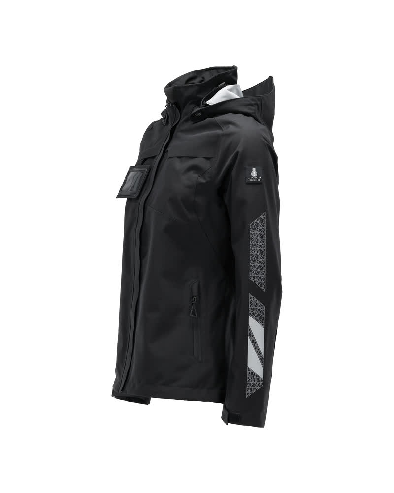 Coupe femme. Imperméable, coupe-vent et permettant au corps de respirer. Coutures thermocollées. Capuche amovible, avec doublure et cordon élastique de serrage. Fermeture zippée et double rabat coupe-vent. Poche intérieure zippée. Porte-badge amovible. Poches latérales zippées. Taille ajustable à l'aide d'un cordon élastique de serrage. Manches renforcées en CORDURA®. Poignets en maille côtelée dissimulés à l'intérieur des manches. Avec motifs imprimés et bandes rétroréfléchissantes.
