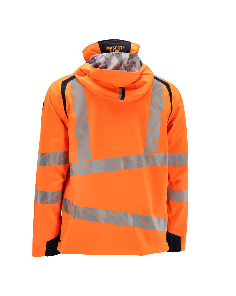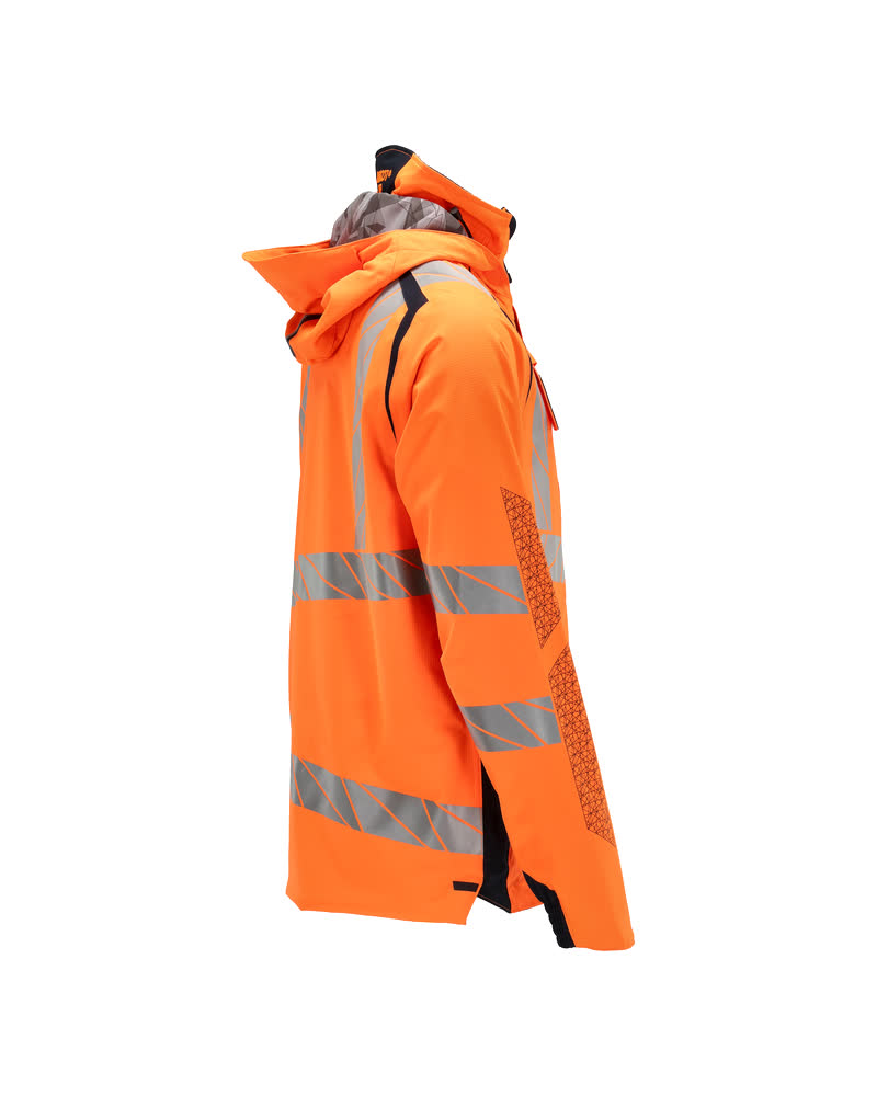 Fluorescent(e) avec bandes rétroréfléchissantes transversales, verticales et en biais. Bicolore. Extrêmement respirant, tout en étant imperméable et coupe-vent. Coutures thermocollées. Capuche amovible, avec doublure et cordon élastique de serrage. Fermeture zippée et double rabat coupe-vent. Poches intérieures - dont deux zippées et une ouverte en filet. Porte-badge amovible. Poche poitrine avec fermeture zippée étanche. Poches latérales avec fermeture zippée étanche. Col montant. Bord-côte intérieur dans le bas avant de la veste. Rabat supplémentaire en bas du dos pouvant être détaché et assurer une longueur supplémentaire pour protéger du froid et du vent. Elastique aux poignets. Avec effets d'impression.