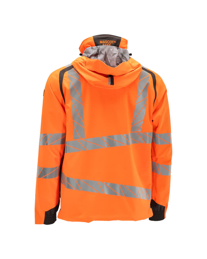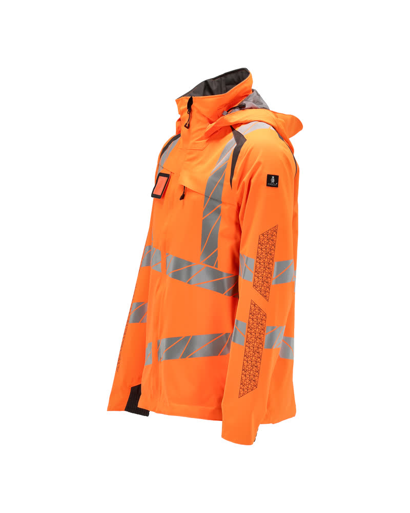 Fluorescent(e) avec bandes rétroréfléchissantes transversales, verticales et en biais. Bicolore. Extrêmement respirant, tout en étant imperméable et coupe-vent. Coutures thermocollées. Capuche amovible, avec doublure et cordon élastique de serrage. Fermeture zippée et double rabat coupe-vent. Poches intérieures - dont deux zippées et une ouverte en filet. Porte-badge amovible. Poche poitrine avec fermeture zippée étanche. Poches latérales avec fermeture zippée étanche. Col montant. Bord-côte intérieur dans le bas avant de la veste. Rabat supplémentaire en bas du dos pouvant être détaché et assurer une longueur supplémentaire pour protéger du froid et du vent. Elastique aux poignets. Avec effets d'impression.