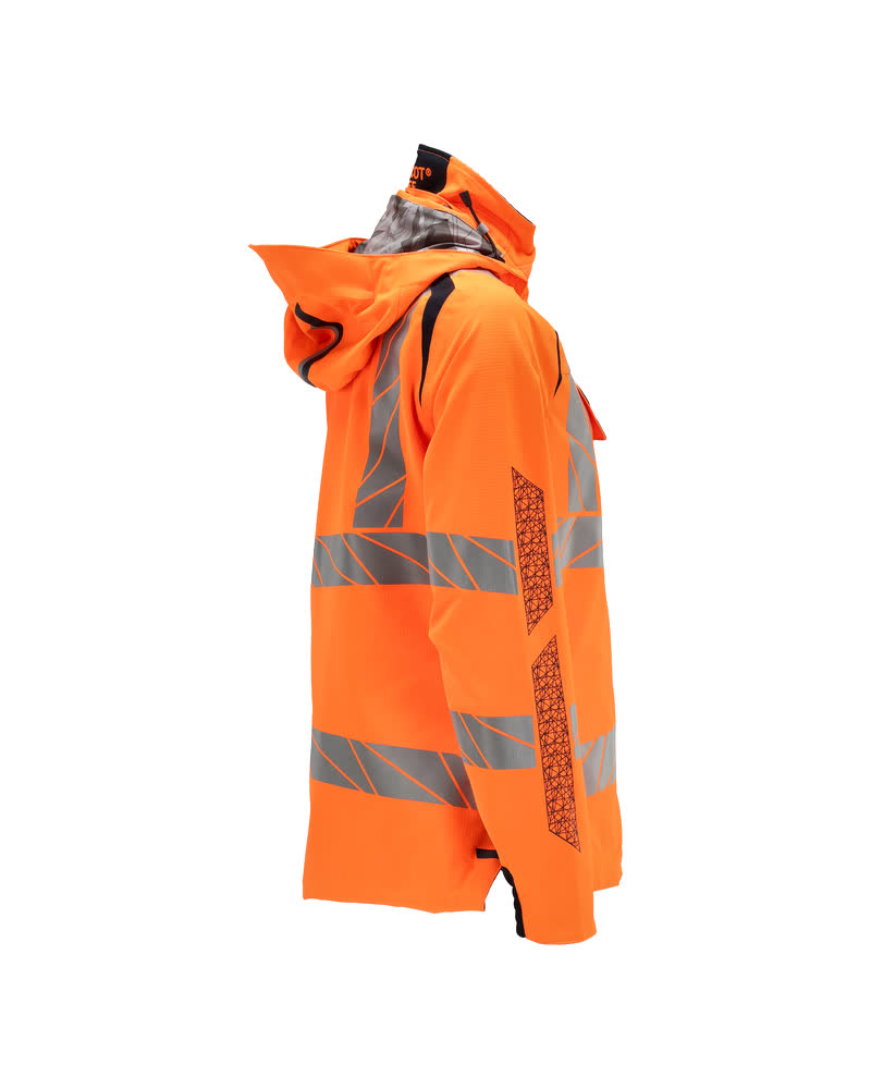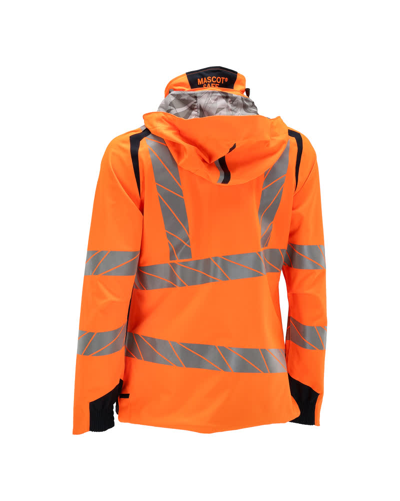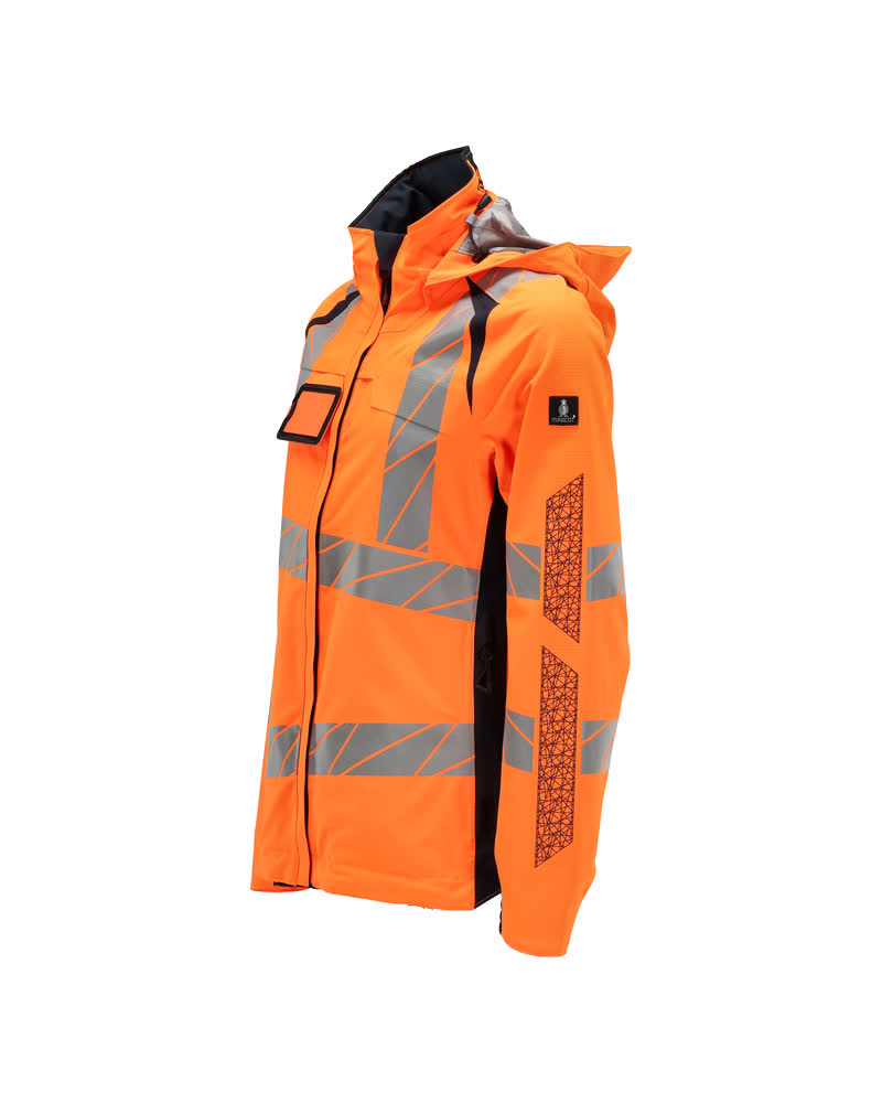 Coupe femme. Fluorescent(e) avec bandes rétroréfléchissantes transversales, verticales et en biais. Bicolore. Extrêmement respirant, tout en étant imperméable et coupe-vent. Coutures thermocollées. Capuche amovible, avec doublure et cordon élastique de serrage. Fermeture zippée et double rabat coupe-vent. Poches intérieures - dont deux zippées et une ouverte en filet. Porte-badge amovible. Poches latérales avec fermeture zippée étanche. Col montant. Bord-côte intérieur dans le bas avant de la veste. Rabat supplémentaire en bas du dos pouvant être détaché et assurer une longueur supplémentaire pour protéger du froid et du vent. Elastique aux poignets. Avec effets d'impression.