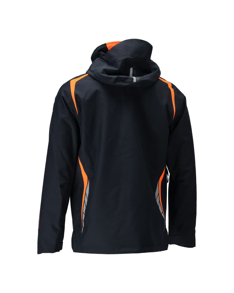Imperméable, coupe-vent et permettant au corps de respirer. Bicolore. Coutures thermocollées. Capuche amovible avec cordon élastique de serrage. Col montant. Fermeture zippée et double rabat coupe-vent. Poche poitrine zippée. Anneau en D. Poche intérieure. Manches ergonomiques pour une grande liberté de mouvement. Rabat coupe-vent aux poignet. Poches latérales. Avec motifs imprimés et bandes rétroréfléchissantes.