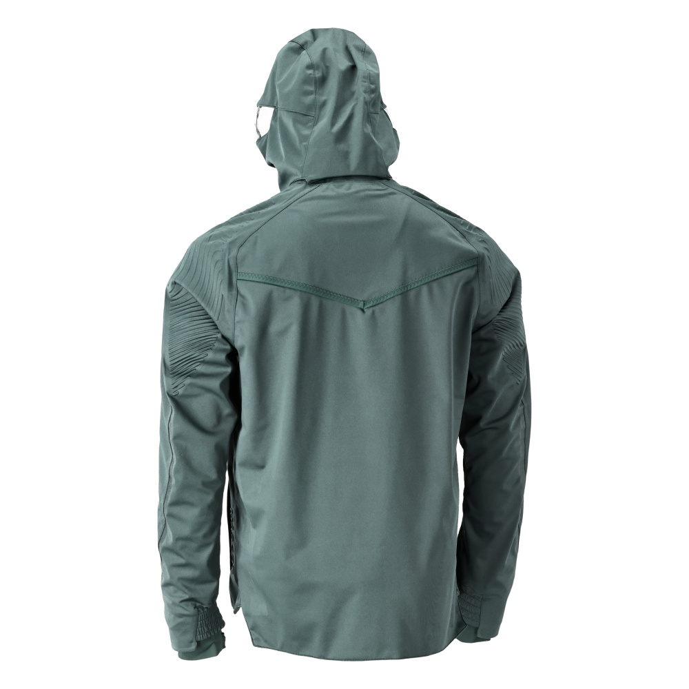 Tissu ultimate stretch de poids léger. Imperméable, coupe-vent et permettant au corps de respirer. Coutures thermocollées. Fermeture zippée et rabat coupe-vent à l'intérieur. Capuche doublée amovible. La capuche est équipée de plastique transparent sur les côtés. Col montant. Poche poitrine zippée. Poches latérales zippées. Porte-badge amovible. Manches ergonomiques pour une grande liberté de mouvement. Poches intérieures. Poignet de manche avec bande élastique. Poignets en maille côtelée dissimulés à l'intérieur des manches. Passe pouce. Dos long. Zip intérieur au bas du dos permettant la réalisation d'impressions/broderies. Effets rétroréfléchissants.