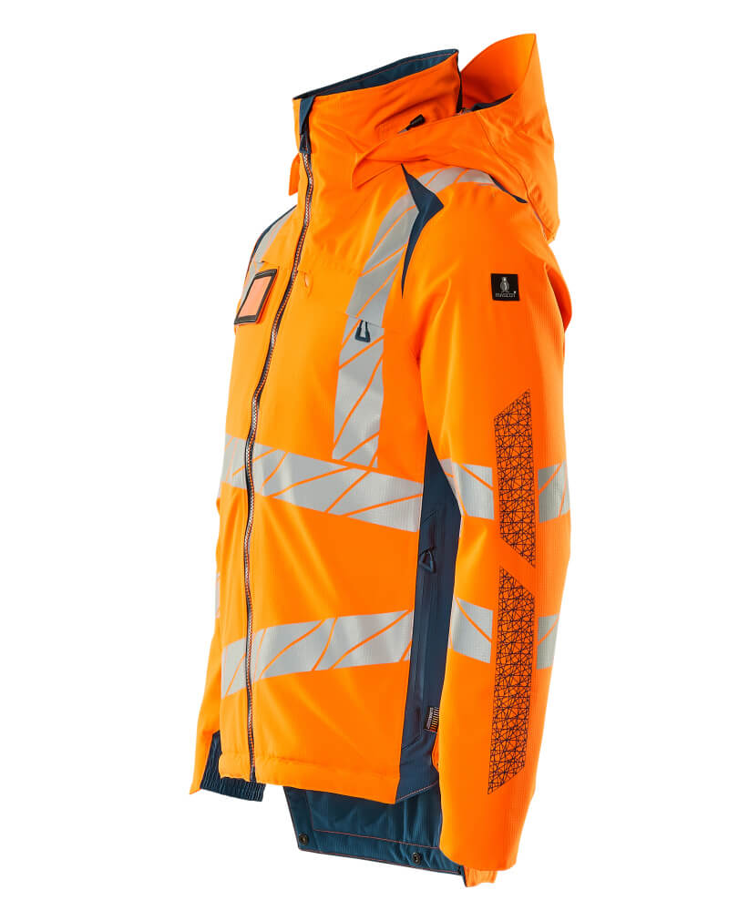 Fluorescent(e) avec bandes rétroréfléchissantes transversales, verticales et en biais. Extrêmement respirant, tout en étant imperméable et coupe-vent. Avec CLIMASCOT® Lightweight Insulation. Bicolore. Coutures thermocollées. Capuche amovible, avec doublure et cordon élastique de serrage. Fermeture zippée et double rabat coupe-vent. Poches intérieures - dont deux zippées et une ouverte en filet. Porte-badge amovible. Poche poitrine avec fermeture zippée étanche. Poches latérales avec fermeture zippée étanche. Col montant. Bord-côte intérieur dans le bas avant de la veste. Rabat supplémentaire en bas du dos pouvant être détaché et assurer une longueur supplémentaire pour protéger du froid et du vent. Elastique aux poignets. Zip intérieur au bas du dos permettant la réalisation d'impressions/broderies. Avec effets d'impression.