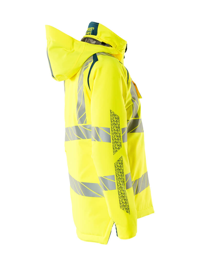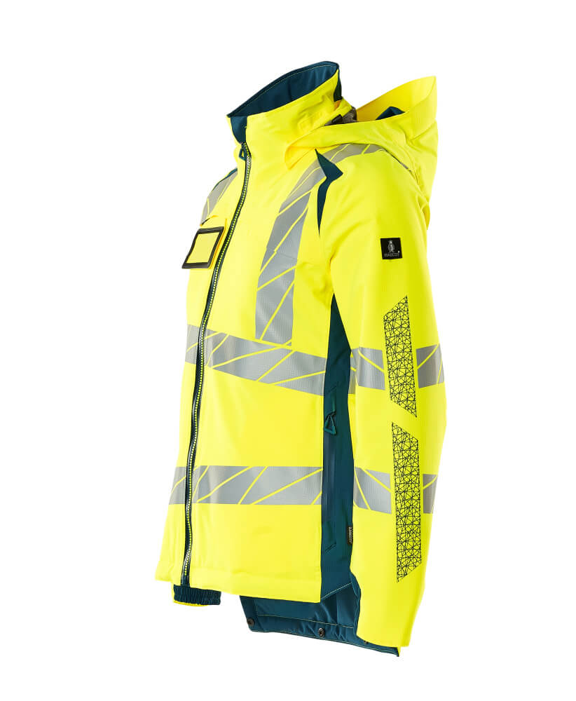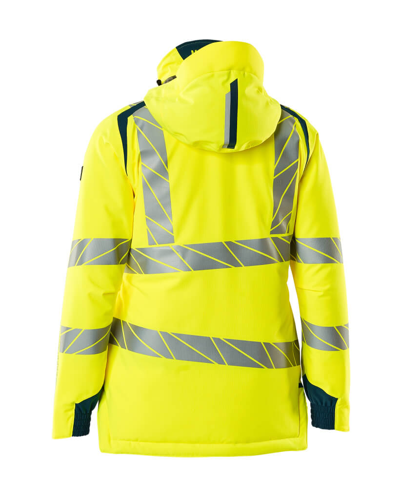 Coupe femme. Fluorescent(e) avec bandes rétroréfléchissantes transversales, verticales et en biais. Extrêmement respirant, tout en étant imperméable et coupe-vent. Avec CLIMASCOT® Lightweight Insulation. Bicolore. Coutures thermocollées. Capuche amovible, avec doublure et cordon élastique de serrage. Fermeture zippée et double rabat coupe-vent. Poches intérieures - dont deux zippées et une ouverte en filet. Porte-badge amovible. Poches latérales avec fermeture zippée étanche. Col montant. Bord-côte intérieur dans le bas avant de la veste. Rabat supplémentaire en bas du dos pouvant être détaché et assurer une longueur supplémentaire pour protéger du froid et du vent. Elastique aux poignets. Zip intérieur au bas du dos permettant la réalisation d'impressions/broderies. Avec effets d'impression.