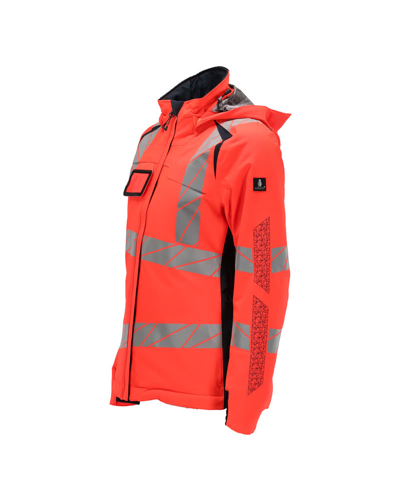 Coupe femme. Fluorescent(e) avec bandes rétroréfléchissantes transversales, verticales et en biais. Extrêmement respirant, tout en étant imperméable et coupe-vent. Avec CLIMASCOT® Lightweight Insulation. Bicolore. Coutures thermocollées. Capuche amovible, avec doublure et cordon élastique de serrage. Fermeture zippée et double rabat coupe-vent. Poches intérieures - dont deux zippées et une ouverte en filet. Porte-badge amovible. Poches latérales avec fermeture zippée étanche. Col montant. Bord-côte intérieur dans le bas avant de la veste. Rabat supplémentaire en bas du dos pouvant être détaché et assurer une longueur supplémentaire pour protéger du froid et du vent. Elastique aux poignets. Zip intérieur au bas du dos permettant la réalisation d'impressions/broderies. Avec effets d'impression.