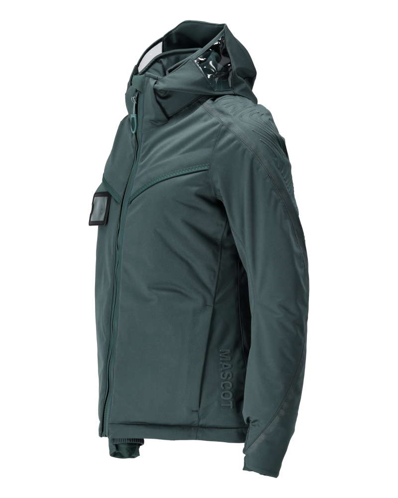 Coupe femme. Tissu ultimate stretch de poids léger. Imperméable, coupe-vent et permettant au corps de respirer. Coutures thermocollées. Avec CLIMASCOT® Lightweight Insulation. Fermeture zippée et rabat coupe-vent à l'intérieur. Capuche doublée amovible. La capuche est équipée de plastique transparent sur les côtés. Col montant. Poches intérieures. Poches latérales zippées. Porte-badge amovible. Manches ergonomiques pour une grande liberté de mouvement. Poignet de manche avec bande élastique. Poignets en maille côtelée dissimulés à l'intérieur des manches. Passe pouce. Dos long. Zip intérieur au bas du dos permettant la réalisation d'impressions/broderies. Effets rétroréfléchissants.