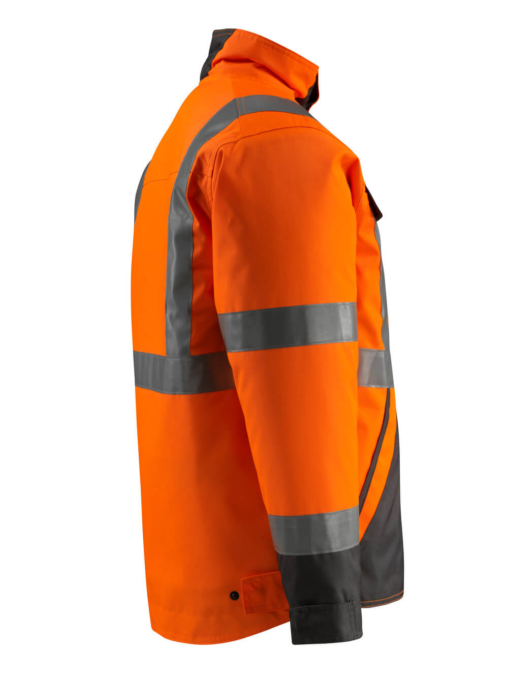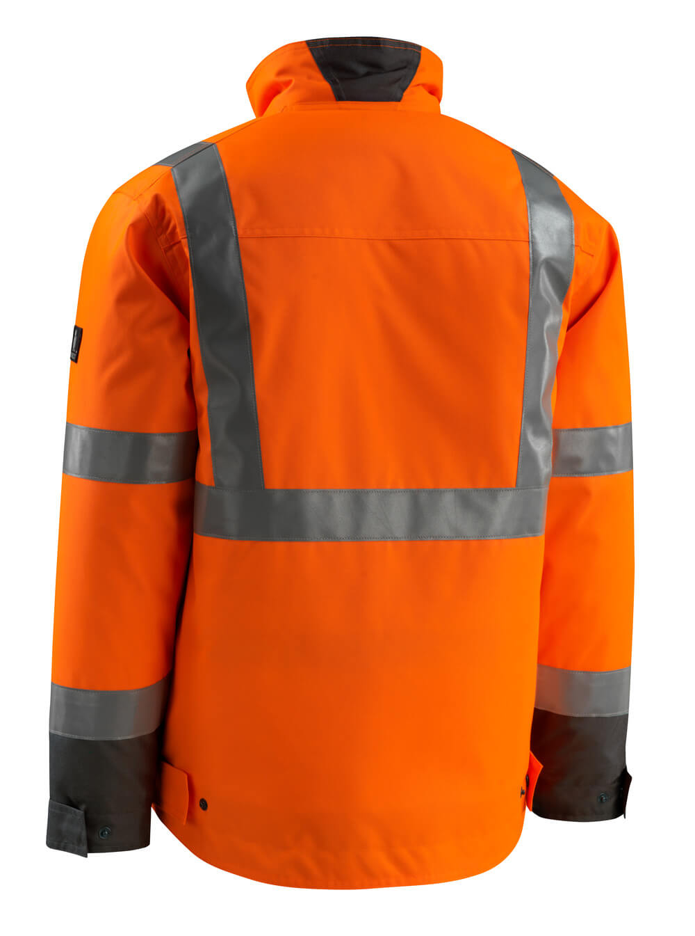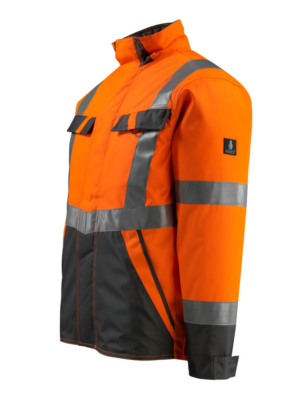 Tissu fluorescent avec bandes rétroréfléchissantes horizontales et verticales. Bicolore. Coupe-vent et hydrofuge. Doublure en matelassé et en polaire matelassée. Fermeture zippée avec rabat coupe vent et boutons-pression non visibles/recouverts. Poche zippée sous rabat coupe-vent. Poches poitrine avec fermeture bouton-pression caché sous rabat. Anneau en D. Poches latérales. Boutons-pression pour resserrer les poignets et le bord inférieur. Zip intérieur au bas du dos permettant la réalisation d'impressions/broderies.