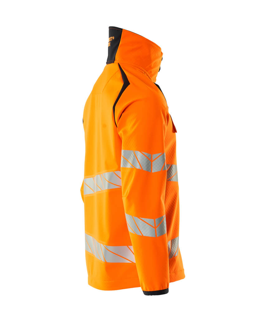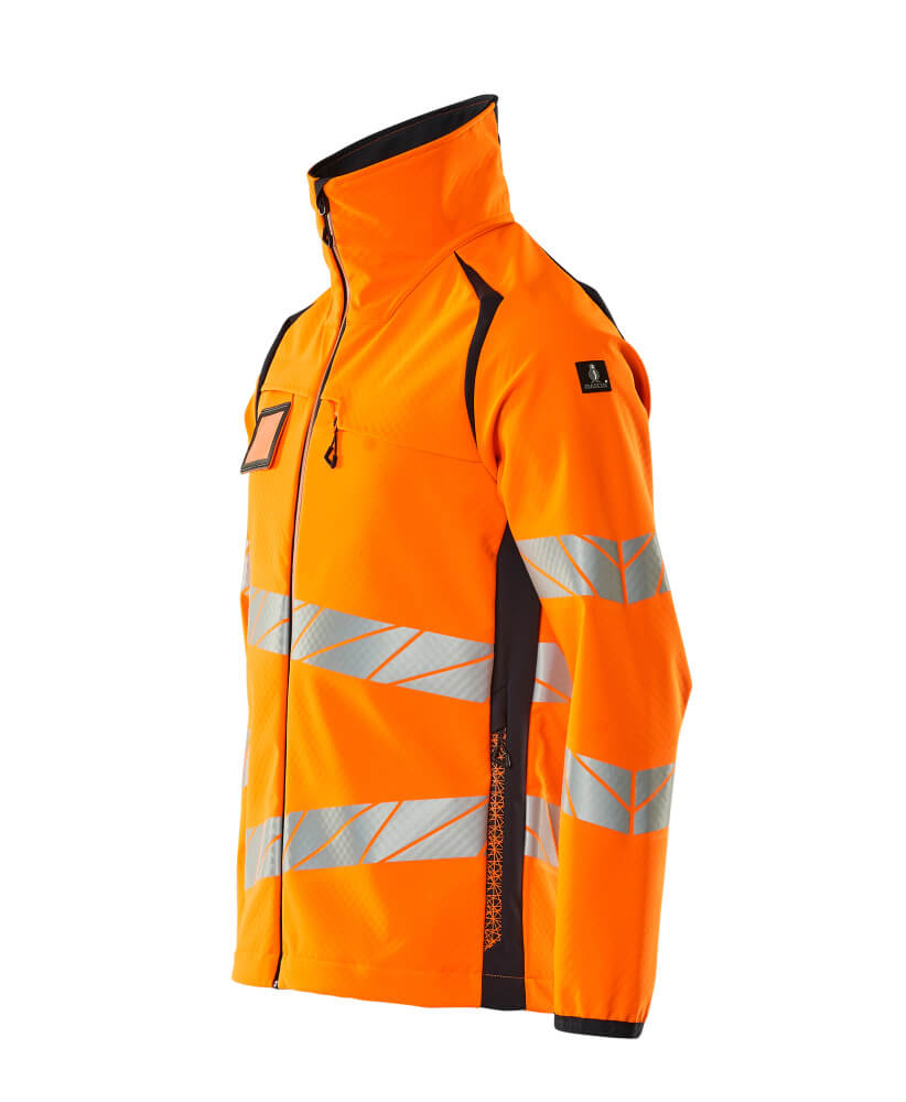 Fluorescent(e) avec bandes rétroréfléchissantes transversales en biais. Coupe-vent, hydrofuge et permettant au corps de respirer. Coupe moderne, plus près du corps mais offrant une excellente liberté de mouvement. Col montant. Bicolore. Fermeture zippée et rabat coupe-vent à l'intérieur. Poche poitrine zippée. Poches latérales avec fermeture zippée étanche. Poches intérieures. Elastique aux poignets. Taille ajustable à l'aide d'un cordon élastique de serrage. Porte-badge amovible.