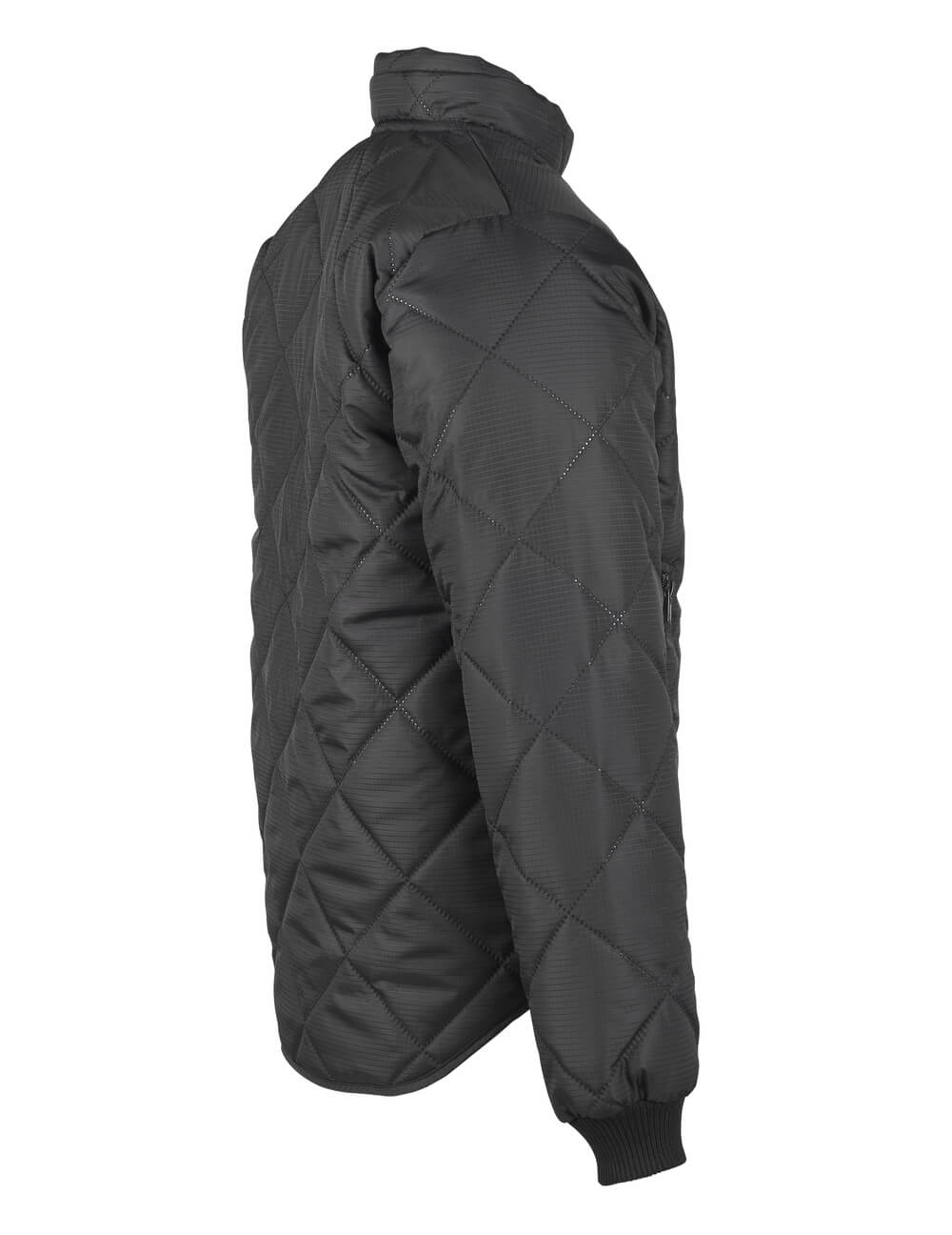 Polyester soudé par ultrasons et isolé avec de la ouate de polyester. Col légèrement incurvé avec intérieur en maille côtelée jusqu'au cou pour garder au chaud. Zip intégral. Poches latérales zippées. Dos long. Taille et poignets en maille côtelée.
