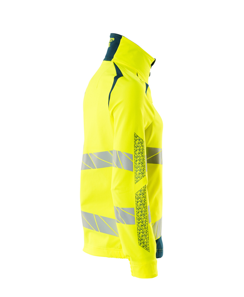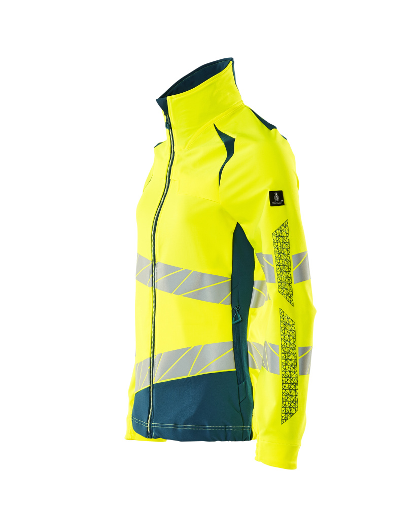 Coupe femme. Fluorescent(e) avec bandes rétroréfléchissantes transversales en biais. Offre une finition hydrofuge. Tissu ultimate stretch de poids léger et résistant. Col montant. Bicolore. Fermeture zippée et rabat coupe-vent à l'intérieur. Compatible avec un porte-badge amovible. Poches latérales zippées. Poches intérieures. Elastiques des deux côtés du bord inférieur. Elastique aux poignets. Ventilation sous les bras. Avec effets d'impression.