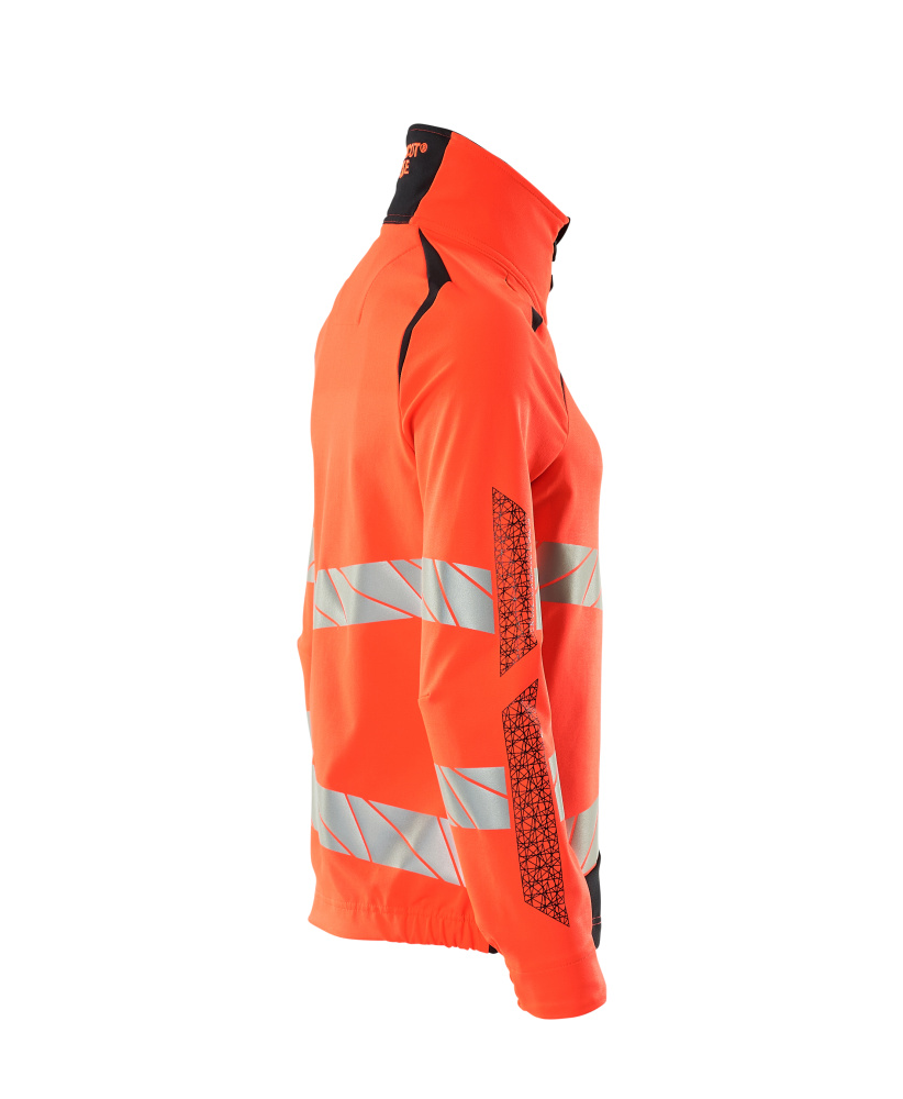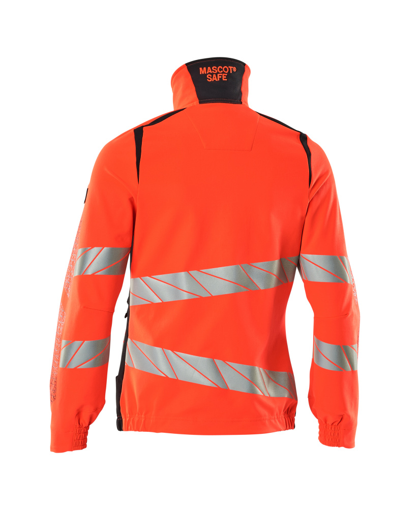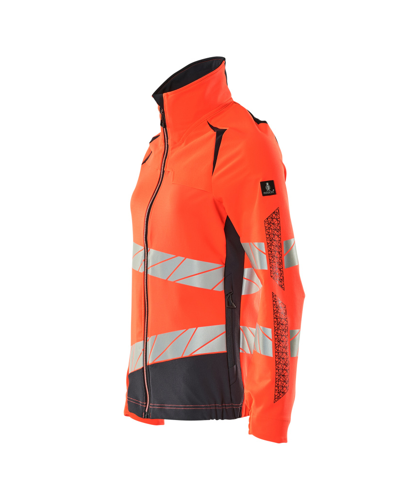 Coupe femme. Fluorescent(e) avec bandes rétroréfléchissantes transversales en biais. Offre une finition hydrofuge. Tissu ultimate stretch de poids léger et résistant. Col montant. Bicolore. Fermeture zippée et rabat coupe-vent à l'intérieur. Compatible avec un porte-badge amovible. Poches latérales zippées. Poches intérieures. Elastiques des deux côtés du bord inférieur. Elastique aux poignets. Ventilation sous les bras. Avec effets d'impression.