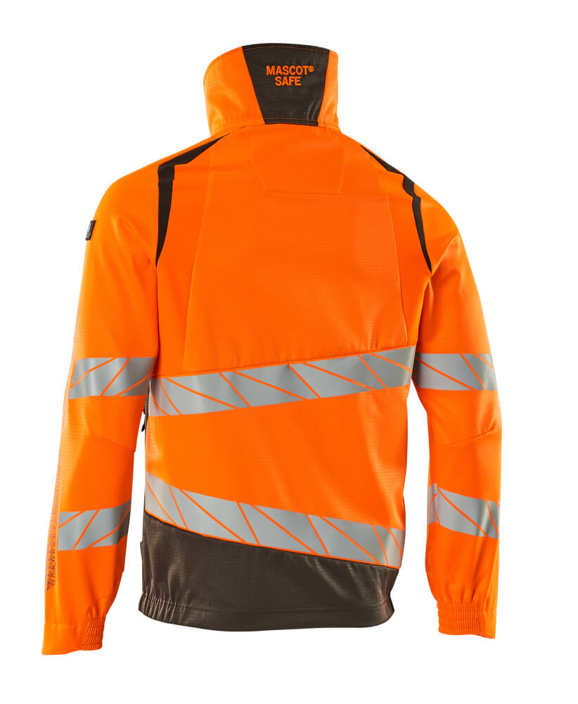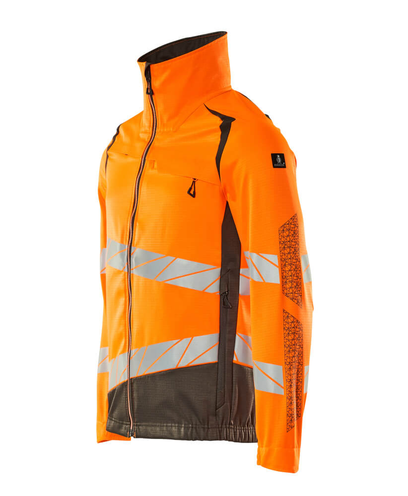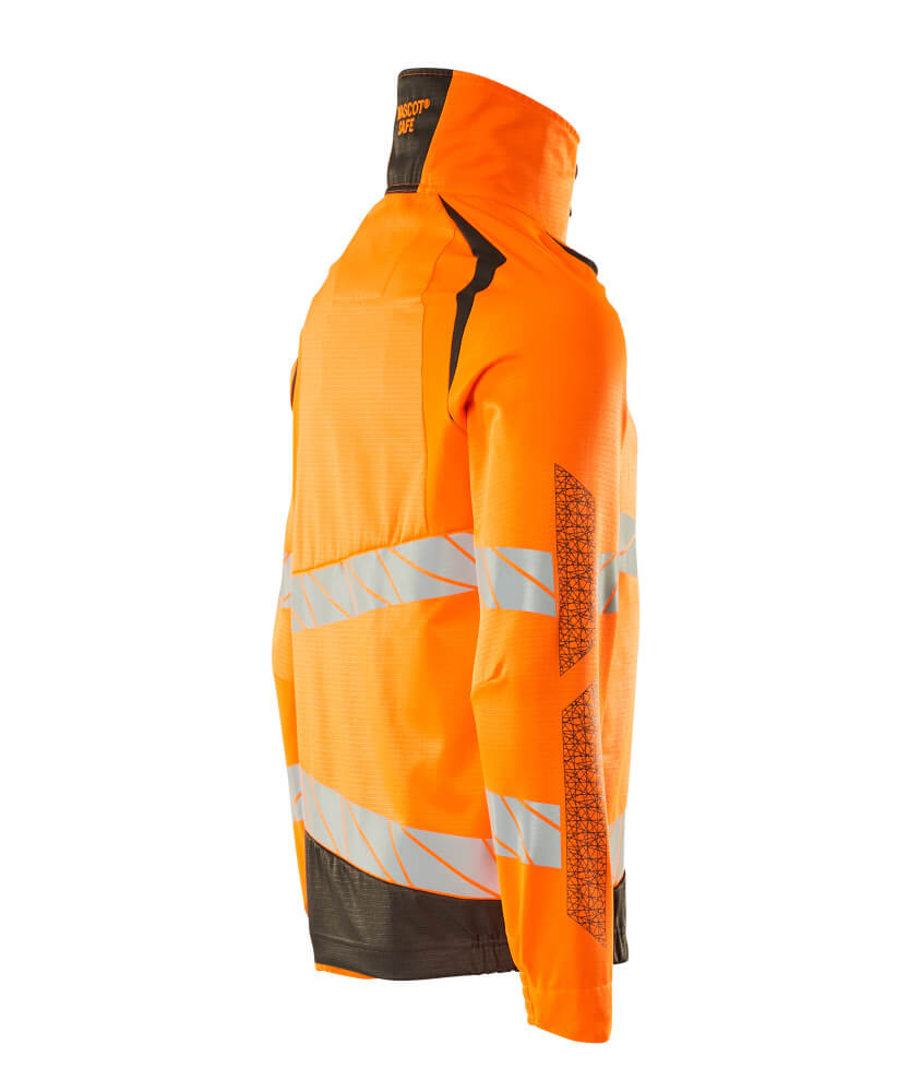 Fluorescent(e) avec bandes rétroréfléchissantes transversales en biais. Certaines parties du vêtement sont en tissu stretch. Combinaison de tissu léger en qualité 236 et de tissu ULTIMATE STRETCH en qualité 511. Bicolore. Col montant. Fermeture zippée et rabat coupe-vent à l'intérieur. Anneau en D. Poche poitrine zippée. Poches latérales zippées. Poches intérieures. Elastiques des deux côtés du bord inférieur. Elastique aux poignets. Avec effets d'impression.