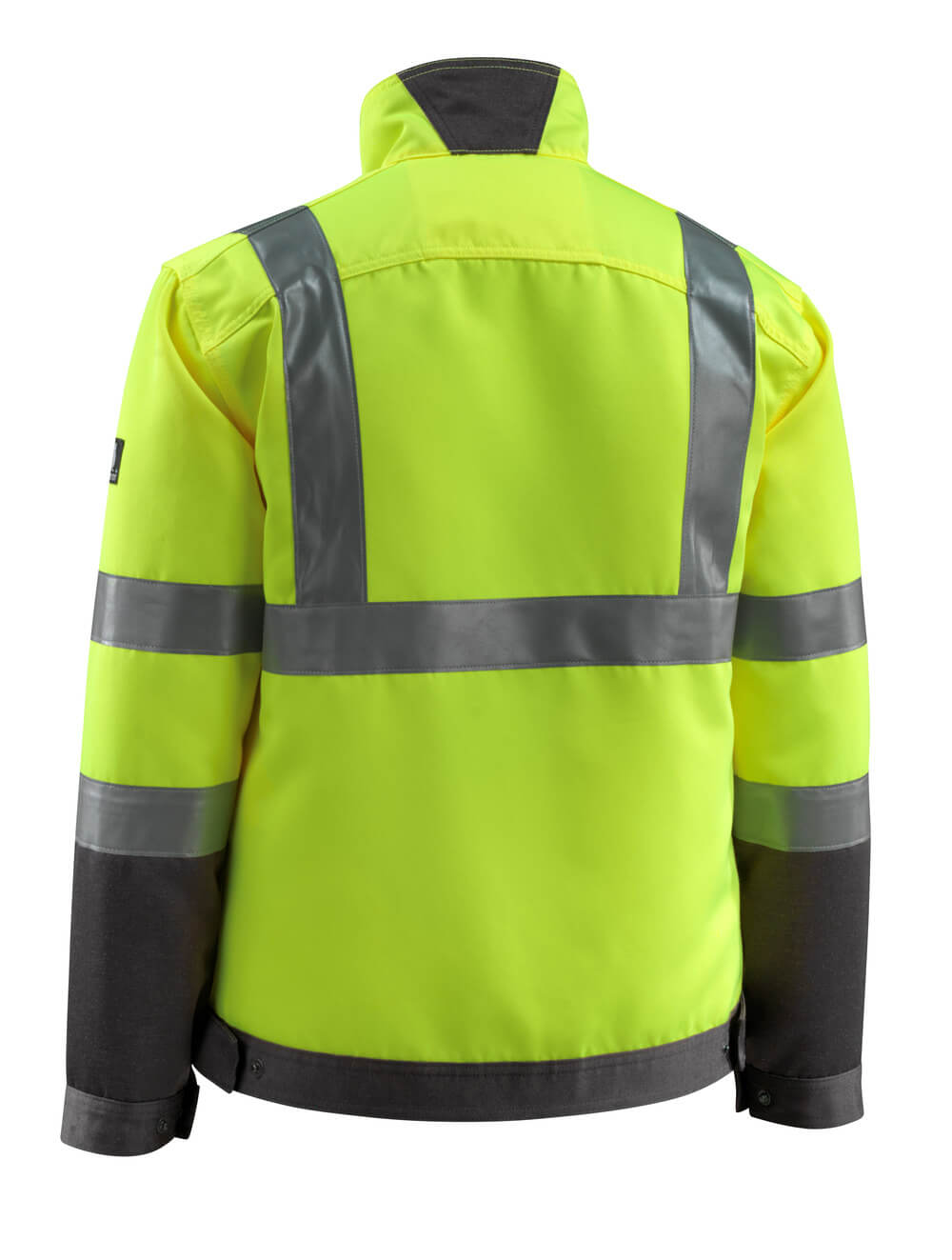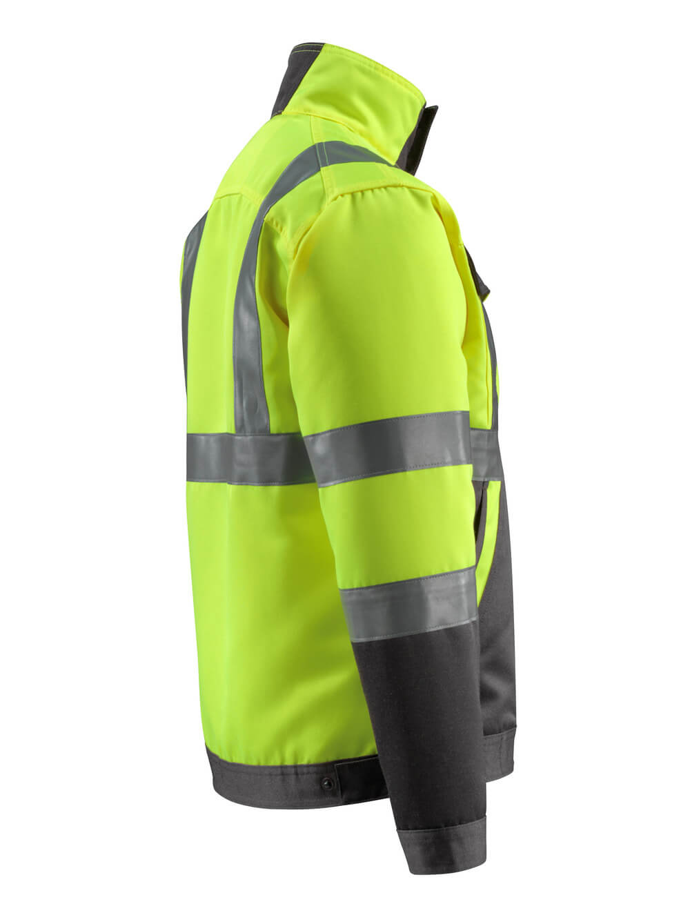 Tissu fluorescent avec bandes rétroréfléchissantes horizontales et verticales. Bicolore. Col montant. Fermeture zippée et rabat coupe-vent fermé par boutons-pression. Poches poitrine sous rabat et avec boutons-pression. Anneau en D. Poches latérales. Poche intérieure. Ajustable sur les hanches à l'aide de boutons-pression. Poignets de manche avec boutons-pression.