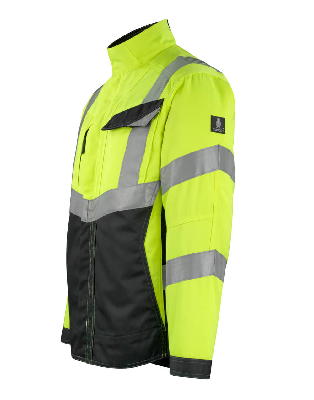 Fluorescent(e) avec bandes rétroréfléchissantes transversales, verticales et en biais. Bicolore. Le traitement de surface rend votre vêtement moins salissant. Col montant. Coutures doubles sur les épaules, les manches et les côtés. Fermeture zippée et rabat coupe-vent fermé par boutons-pression. Dos long. Poche poitrine zippée. Poche poitrine sous rabat avec fermeture bouton-pression. Anneau en D. Manches ergonomiques pour une grande liberté de mouvement. Poches latérales. Poches intérieures. Ventilation sous les bras. Ajustable sur les hanches à l'aide de boutons-pression. Poignets de manche avec boutons-pression.