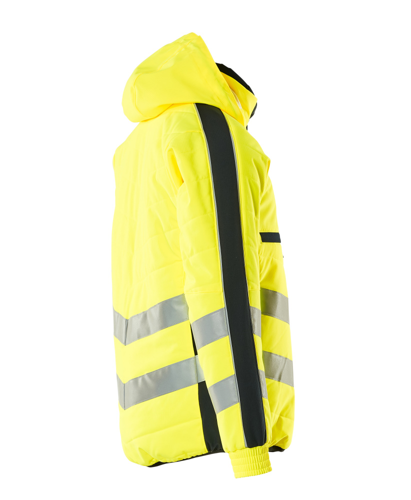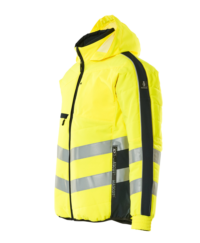 Fluorescent(e) avec bandes rétroréfléchissantes transversales en biais. Bicolore. Coupe-vent, hydrofuge et permettant au corps de respirer. Rembourré avec du polyester. Fermeture zippée et rabat coupe-vent à l'intérieur. Capuche pouvant être pliée et rentrée dans le col. Poche intérieure zippée spécialement conçue pour le téléphone avec des trous pour les écouteurs et des boucles pour maintenir les câbles. Poches poitrine zippées. Anneau en D. Poche stylo. Poches latérales zippées.
