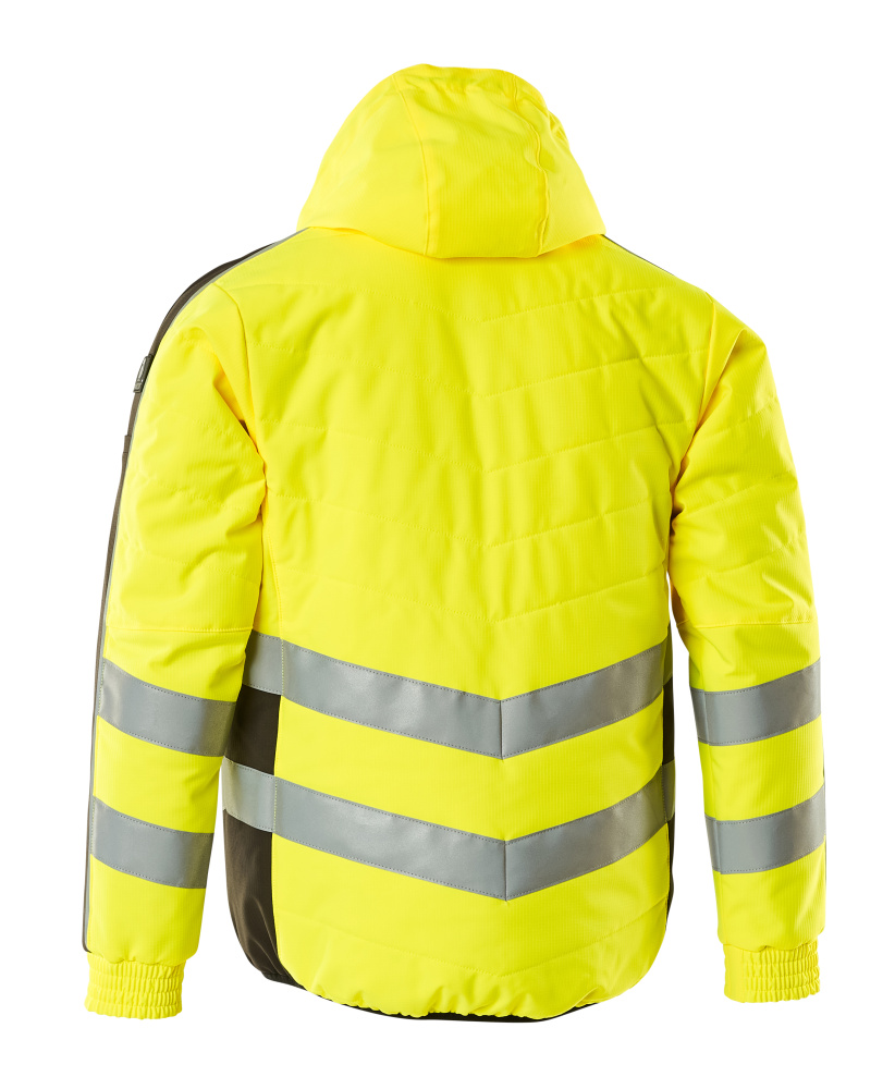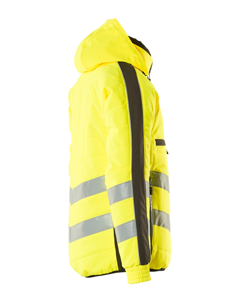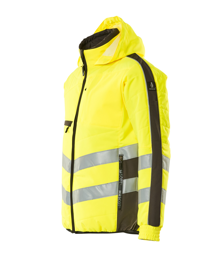 Fluorescent(e) avec bandes rétroréfléchissantes transversales en biais. Bicolore. Coupe-vent, hydrofuge et permettant au corps de respirer. Rembourré avec du polyester. Fermeture zippée et rabat coupe-vent à l'intérieur. Capuche pouvant être pliée et rentrée dans le col. Poche intérieure zippée spécialement conçue pour le téléphone avec des trous pour les écouteurs et des boucles pour maintenir les câbles. Poches poitrine zippées. Anneau en D. Poche stylo. Poches latérales zippées.