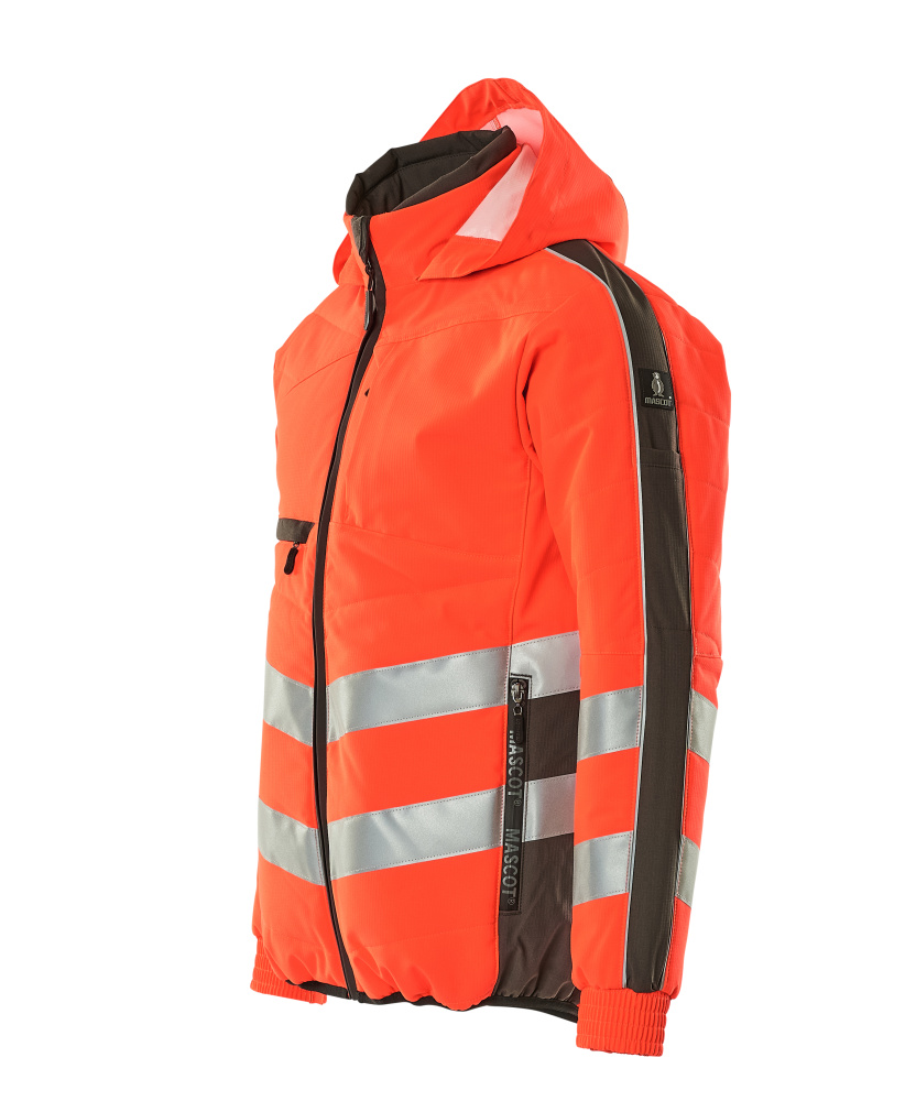 Fluorescent(e) avec bandes rétroréfléchissantes transversales en biais. Bicolore. Coupe-vent, hydrofuge et permettant au corps de respirer. Rembourré avec du polyester. Fermeture zippée et rabat coupe-vent à l'intérieur. Capuche pouvant être pliée et rentrée dans le col. Poche intérieure zippée spécialement conçue pour le téléphone avec des trous pour les écouteurs et des boucles pour maintenir les câbles. Poches poitrine zippées. Anneau en D. Poche stylo. Poches latérales zippées.