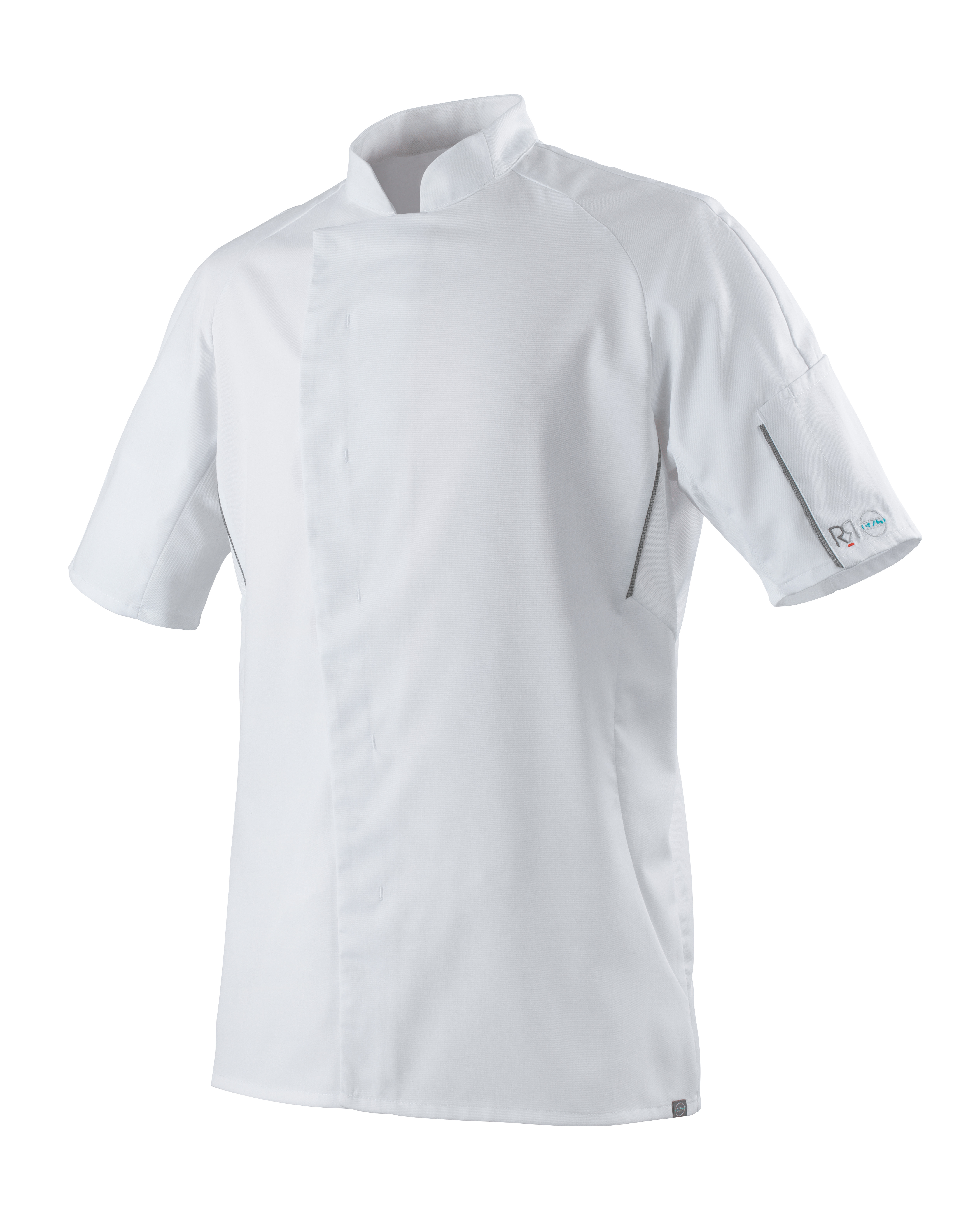 Col Mao Boutons pression cachés Apport de maille 37,5® sous les bras et sur le col Plastron asymétrique Apport de liserés fantaisie contrastés Poche plaquée bas de manche gauche avec compartiment stylo Vignette tissée et broderie 37,5®