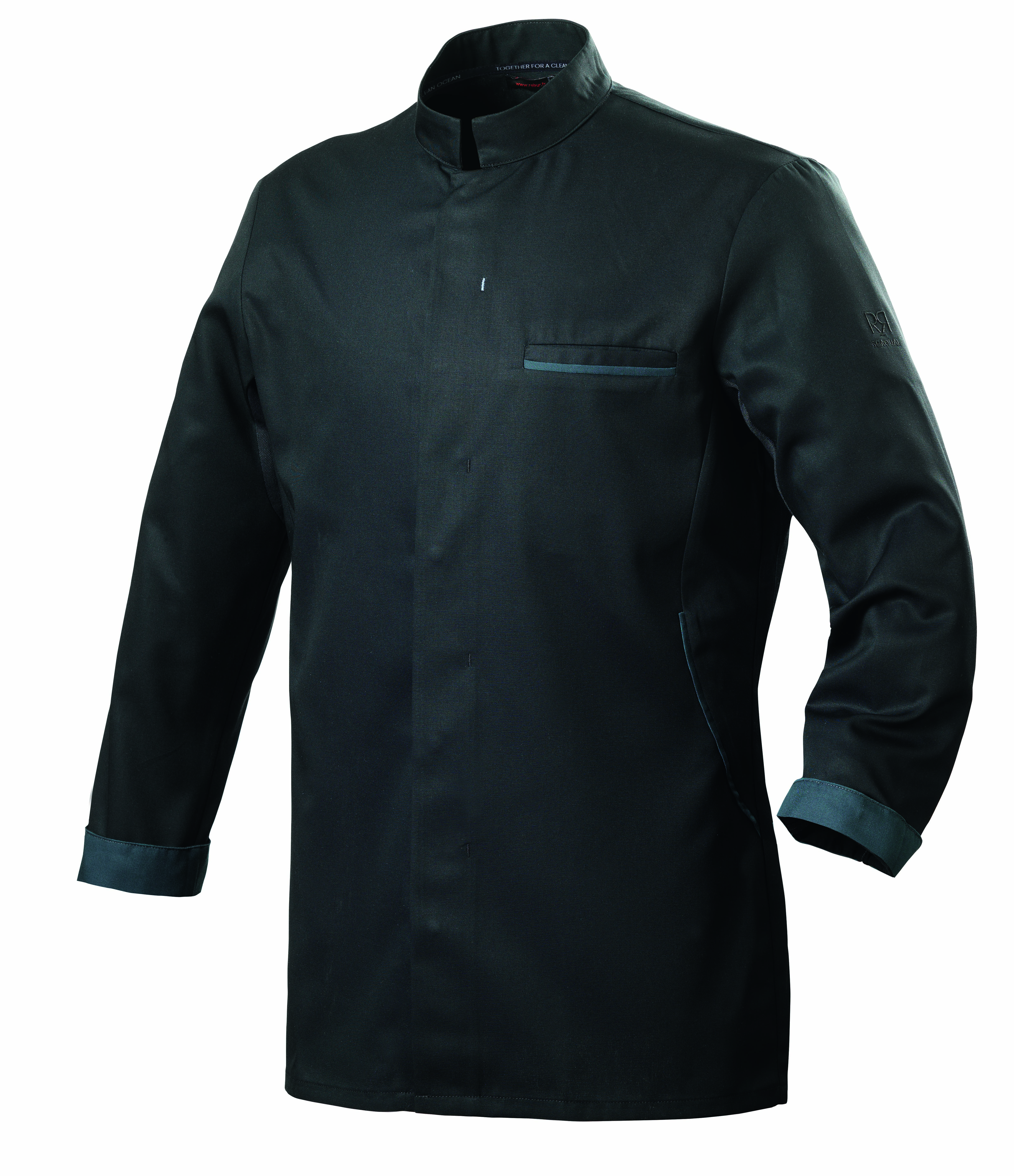Col Mao Boutons pression cachés Liserés contrastés dans les découpes côtés et dans la poche poitrine Revers bas de manches contrastés Poche poitrine passepoilée