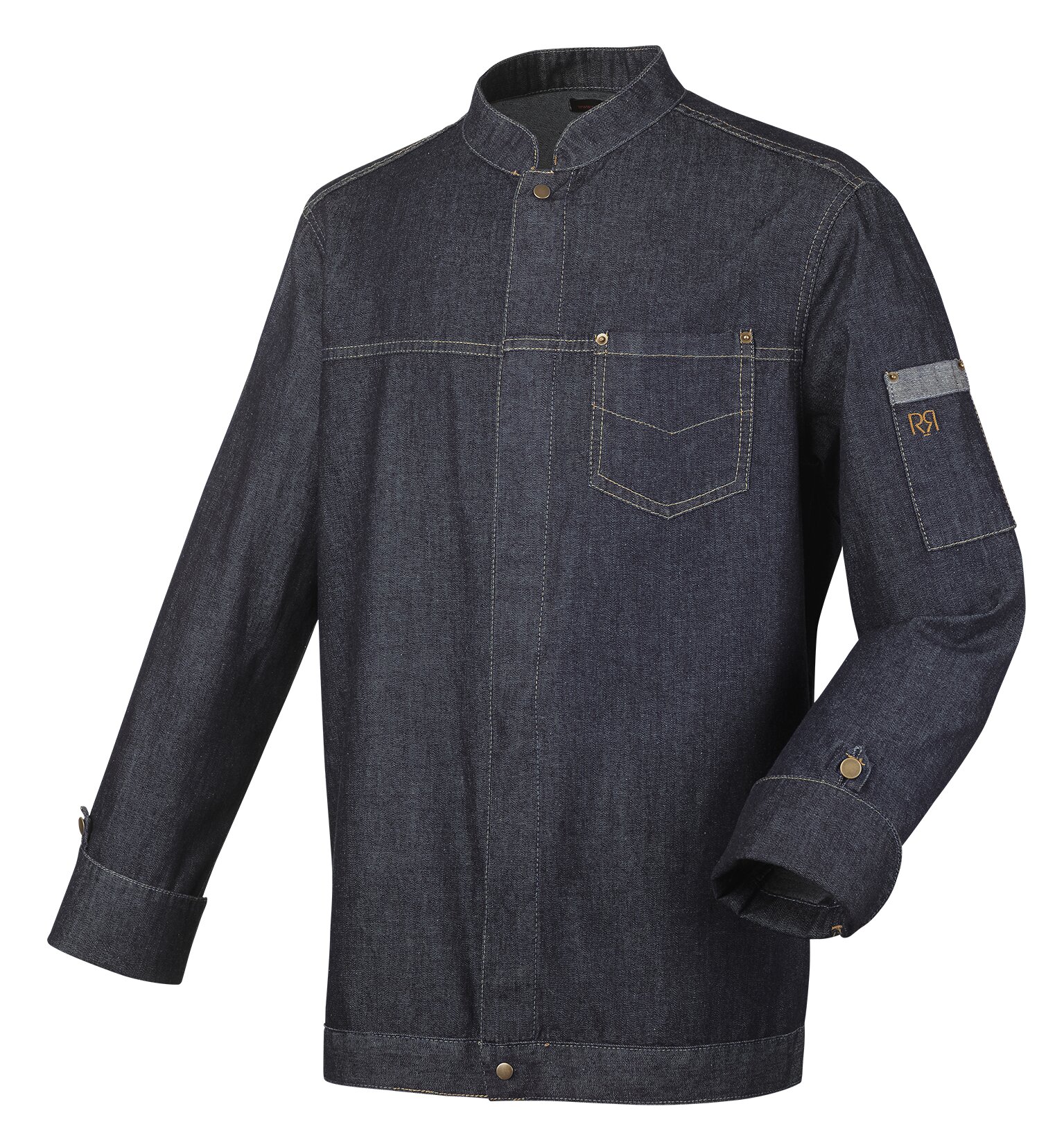 Col Mao Devant fermé par 2 pressions métal vieilli haut et bas + pressions cachées 2 plis dos pour une meilleure aisance Bouton clou avec passant pour maintenir le revers de manche Réglage bas vêtement par pattes + boutons clous dans le dos Poche poitrine avec surpiqure fantaisie Poche stylo plaquée sur manche gauche